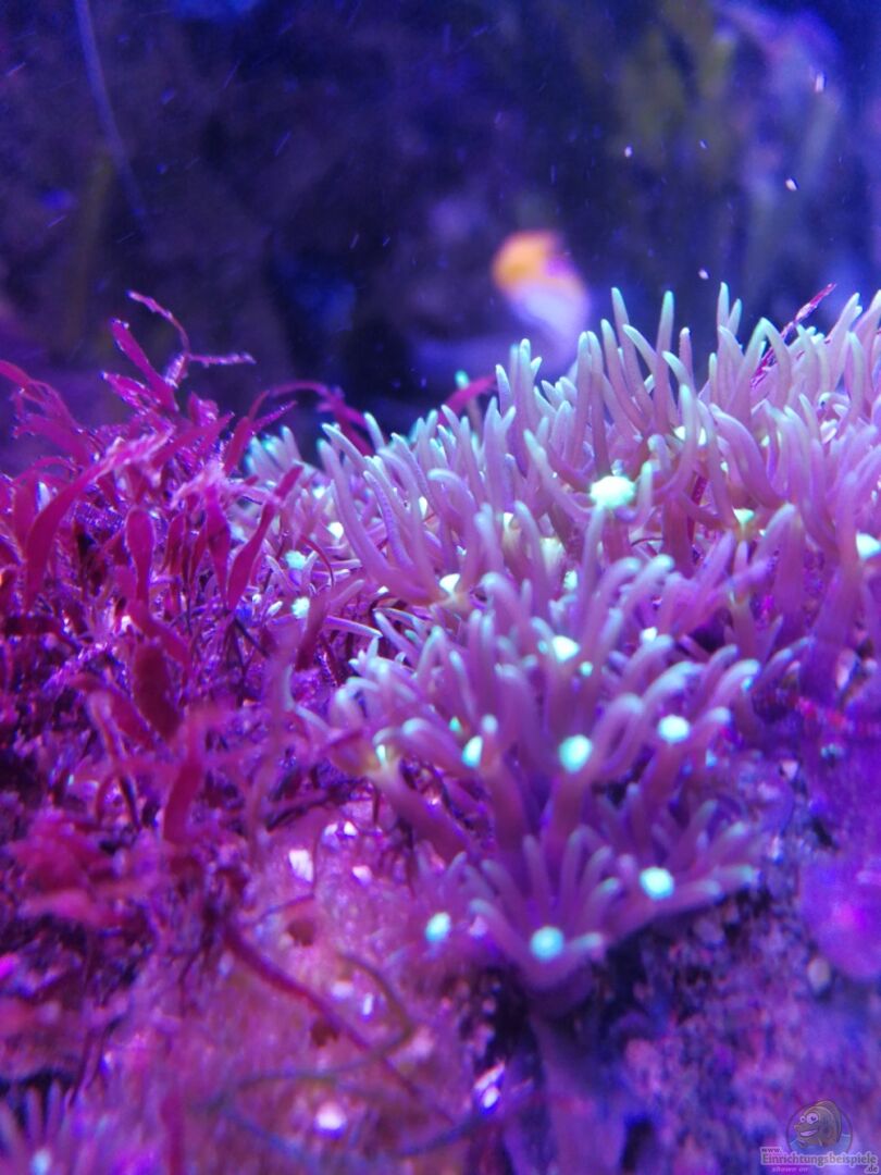 Tiere: 2x Einsiedlerkrebse 3x Schnecken 1x Röhrenwurm 1x Goldstirnschläfergrundel Korallen: -Pachyclavularia violacea -Euphylia ancora -Tubipora musica -Seriotopora caliendrum -Seriopora hystrix -Acropora sp. -Krustenanemone/Zoanthus -Stylophora "Milka" -Parazoanthus gelb Algen: -rote Alge - Aus dem LG: 1x Rundkrabbe -versch. Anemonen -Ohrschnecken -Schlangenseesterne