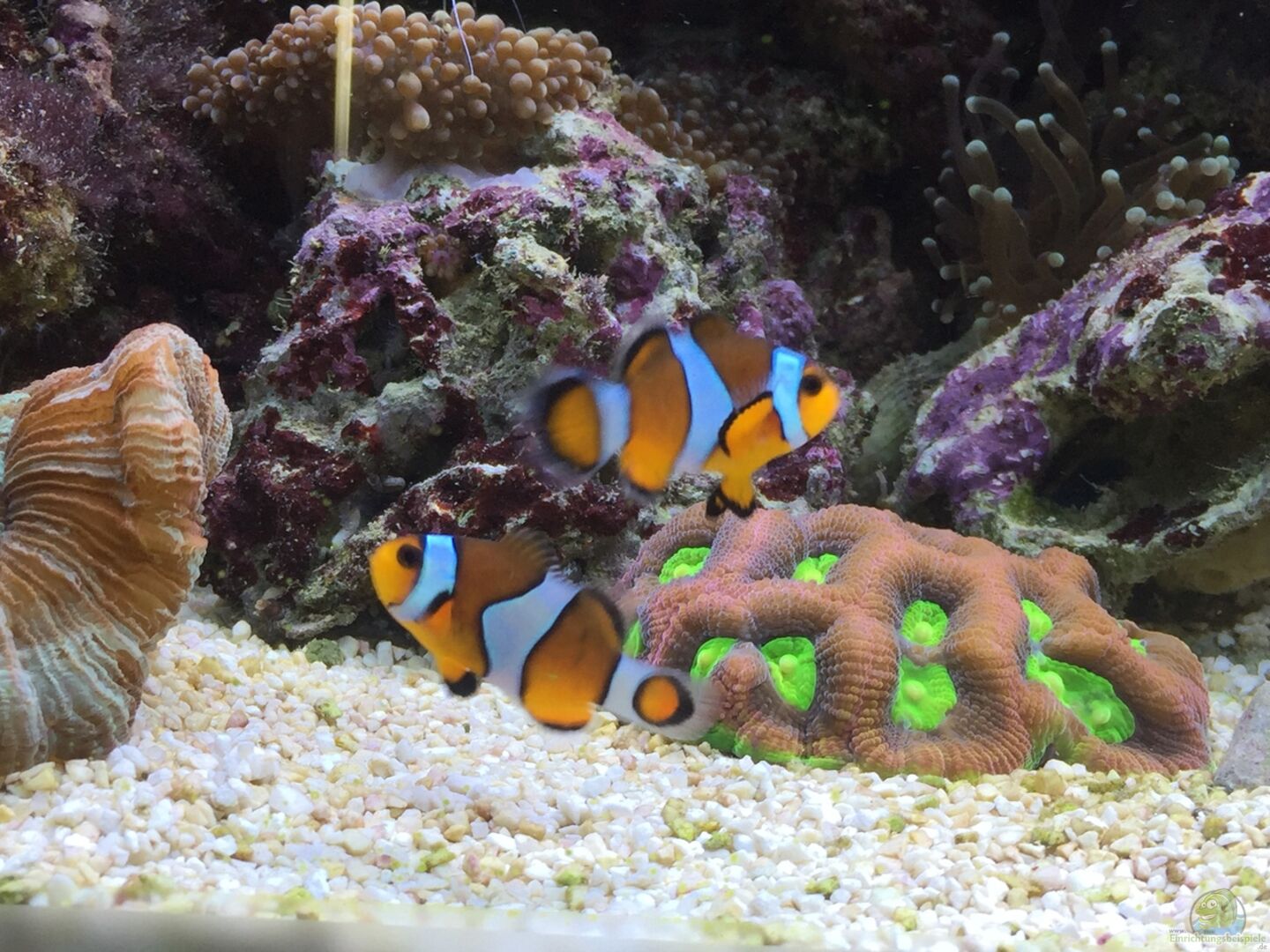3 Amphiprion ocellaris (falscher Clownfisch), hatte zuerst 1 Pärchen, leider ist 1 Fisch eingegangen. Hinterher wurde ein weiteres Pärchen bestellt. Bisher vertragen sich alle 3 sehr gut. Sofern sich ein Pärchen herauskristallisiert, wird der 3. Fisch weggegeben. 1 Cryptocentrus cinctus (Zitronengrundel) in Symbiose mit einem Alpheus bellulus (Hübscher Knallkrebs) 1 Koumansetta rainfordi (Rainfords Grundel) 3 Chromis viridis (Grüne Schwalbenschwänzchen) 1 Gramma Loreto (Königs-Feenbarsch) 4 [...]