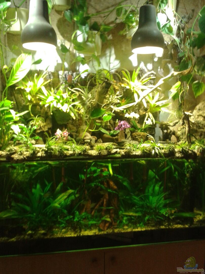 Das Paludarium wurde über Wasser komplett umgestaltet. Die beiden 125 Watt HQL-Strahler wurden gegen gebrauchte 70 Watt Duplalux-LI Seilzugleuchten, die neu lackiert wurden, getauscht. Die Pflanzen in den Hydrokulturtöpfen wurden entfernt, da diese derma??en ausgewachsen waren und das ganze Paludarium zugewuchert hatten (viele lange Ranken die kahl waren und nur noch an den enden Blätter hatten). An den Wänden über dem Aquarium wurden Korkplatten, an denen Kokosnuss- und Paranussschalen [...]