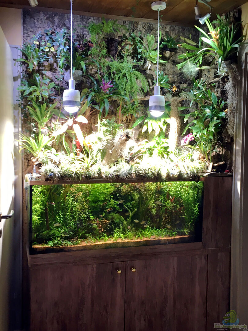 Das Paludarium wurde über Wasser komplett umgestaltet. Die beiden 125 Watt HQL-Strahler wurden gegen gebrauchte 70 Watt Duplalux-LI Seilzugleuchten, die neu lackiert wurden, getauscht. Die Pflanzen in den Hydrokulturtöpfen wurden entfernt, da diese derma??en ausgewachsen waren und das ganze Paludarium zugewuchert hatten (viele lange Ranken die kahl waren und nur noch an den enden Blätter hatten). An den Wänden über dem Aquarium wurden Korkplatten, an denen Kokosnuss- und Paranussschalen [...]