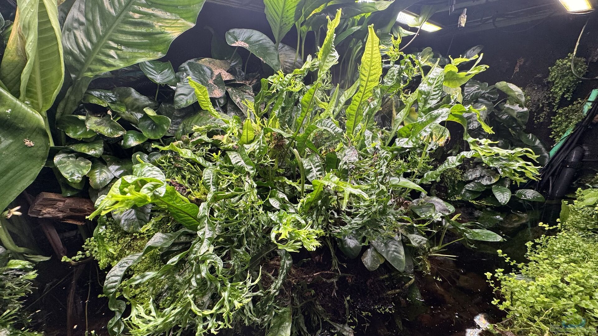 Die Gesamtlänge verteilt sich auf zwei rechtwinklig angeordnete Schenkel von 300cm und 160cm. Der Unterbau ist ein Stahlgestell mit Einbauteilen aus dem Küchenbau. Es geht mir darum ein grundsätzlich pflegeleichtes "urkaubsfestes" Aquarium zu haben. Im Paludarium leben sechs Frösche Amnirana Gakamensis, zu deutsch Galam Weißlippenfrasch. Eigentlich hätte ich Baumsteiger/Pfeilgiftfrösche bevorzugt, aber die sind nicht schwimmfähig, also für das Paludarium nicht geeignet, außerdem [...]