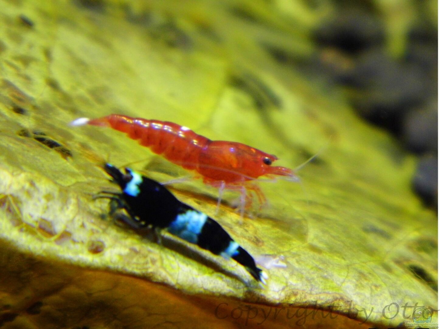 In den beiden Hälften sind nur schwarze und rote Bienengarnelen (Caridina cf. cantonensis) mit Tai-Genen nach Farbe selektiert.