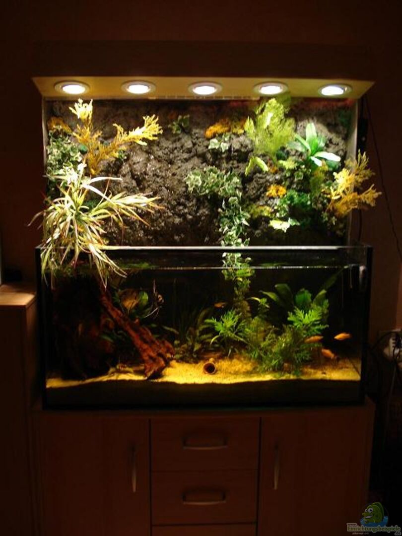 Verkleidung des offenen Aquarium und die Steinwand ( oberhalb des Wassers) für den Jungel selber gebaut. Mit Lampen, Holzgestell, Pflanzen und Wasserfall.