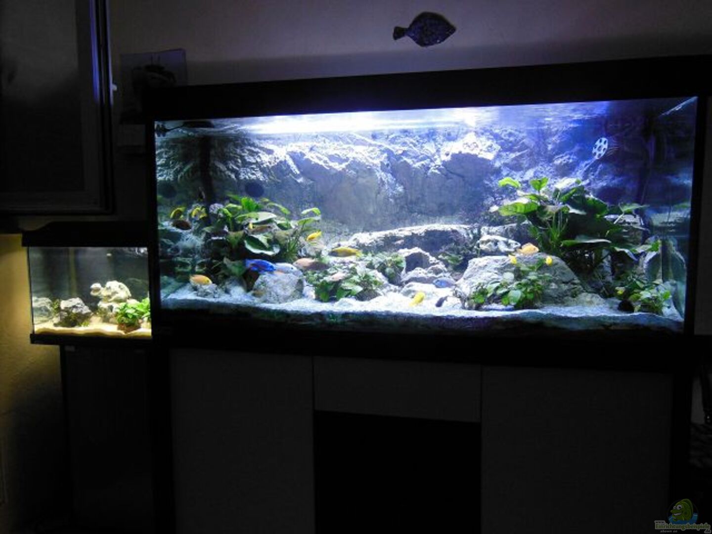 Nachdem in den ersten Wochen nur gleich gro??e Tiere vom Kölle Zoo eingesetzt waren, wurden nach ein paar Wochen die ersten ruppigen Artgenossen (fire fish und eurekas) wegen des zunehmend erhöhten Aggressionspotentials durch Jungtiere von den diversen o.a. Quellen ersetzt. Mein Dank geht an meinen Stammladen und insbesondere den Herbert von Stark-Aquaristik. Mittlerweile haben die Raufbolde schon wieder neue Schwimmräume gefunden. Aktuell sieht der (nun relativ friedliche) Besatz so aus: 2, [...]