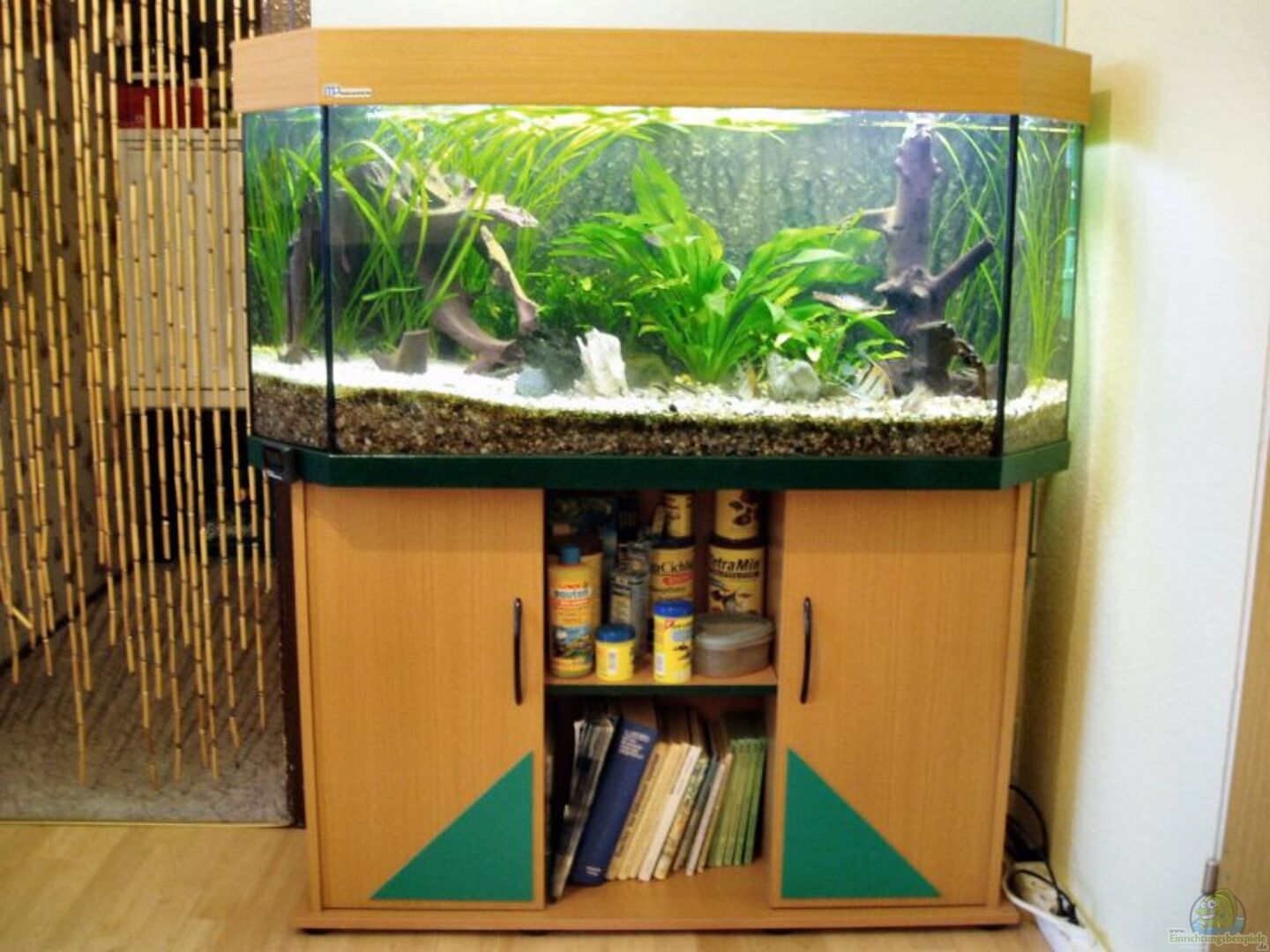 Panorama-Becken, 12 mm Glas wulstverklebt, Unterschrank und Abdeckung in Buchenoptikund nach meiner Vorstellung modifiziert, JUWEL Aquarienrückwand mit ausgeprägter Rindenstrucktur an die Heckscheibe mit Silicon geklebt