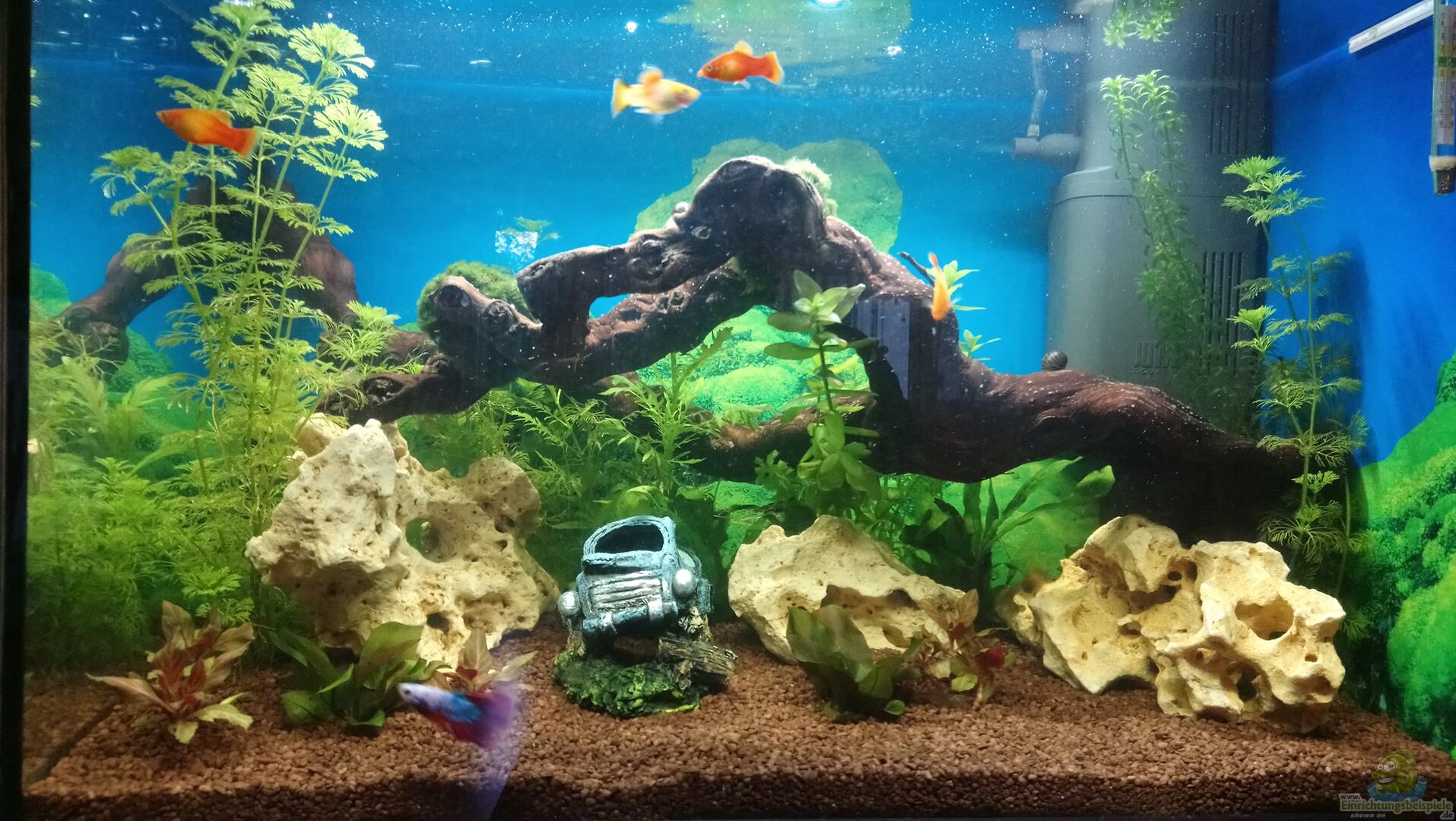 Bei meinem Becken handelt es sich um ein Juwel Primo 70 LED Aquarium Set mit wei??em Deckel und Unterrahmen. Als Unterschrank musste ein Regal einer schwedischen Möbelfirma herhalten, das ich dann noch zusätzlich an der Wand verschraubt habe, um die Stabilität zu gewährleisten. Nachdem ich alles im dem Aquarium eingerichtet hatte, gingen nur noch 60 Liter Wasser rein.