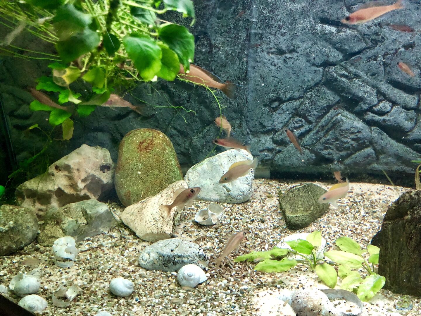 1.2.x Paracyprichromis nigripinnis (die Jungfische wachsen sehr gut) 3.1.x Neolamprologus caudopunctatus (ein Pärchen, das fleißig brütet) 0.1 Ancistrus spec. (älteres Tier, das hier seinen Platz fand)