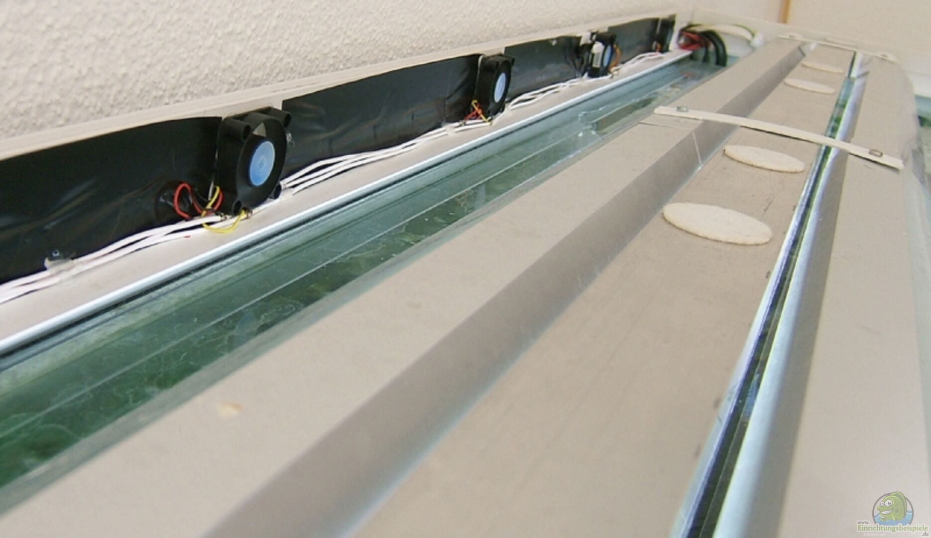 Fünf 12V PC Ventilatoren 4x4 cm (Conrad, sehr geräuscharm) für die Wärmeabfuhr in der Abdeckung. Hat sich sehr bewährt! Es ist auch nie feucht unter der Abdeckung!