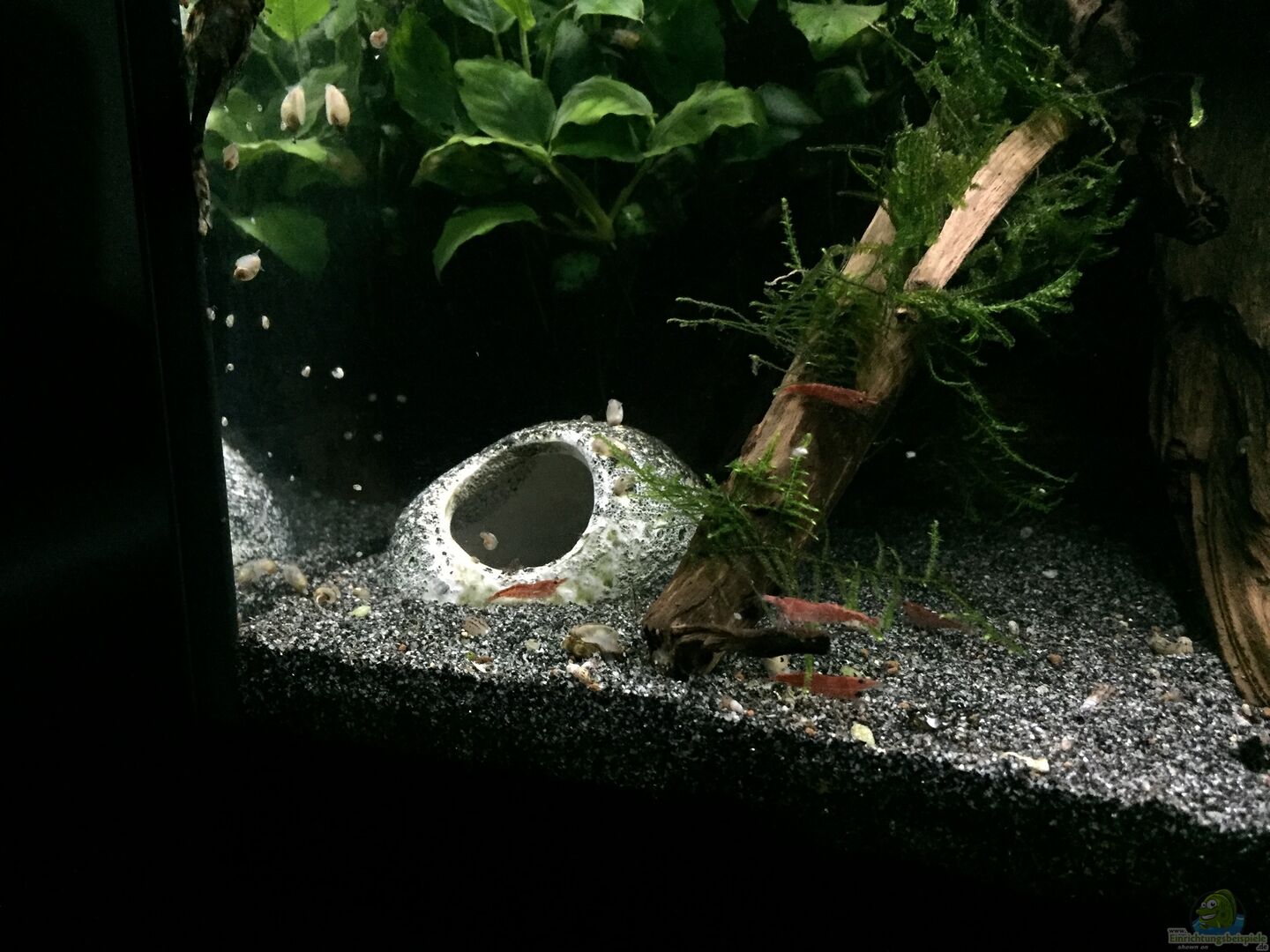Die Einrichtung besteht aus 4 Stücken Lochgestein, welches das Wasser allerdings nicht (mehr) aufhärtet. Zudem befindet sich noch zwei Keramikhöhlen sowie mehrere Moorkienwurzeln in dem Aquarium. Zwischen den Wurzeln und Steinen bestehen zahlreiche Zwischenräume und Rückzugsplätze für die Bewohner. Die Moorkienwurzeln sind zudem eine wichtige Nahrungsergänzung für die kleinen Rotpunktantennenwelse. Au??erdem befinden sich noch Seemandelbaumblätter, Buchen-/Eichenlaub und Erlenzapfen [...]