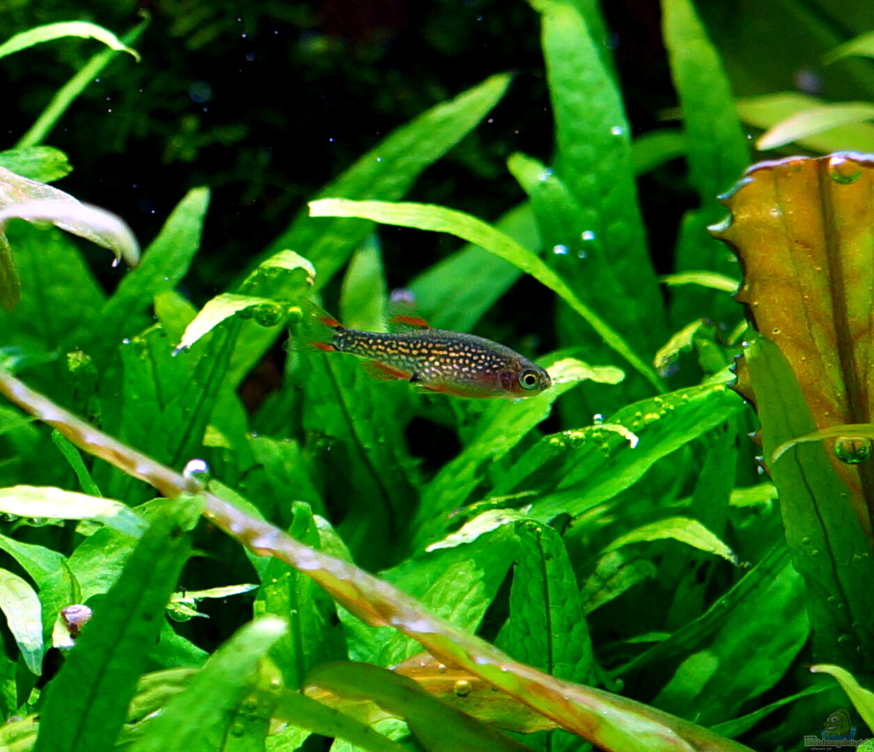 Fische: - 40-45 Perlhuhnbärblinge (Danio margaritatus) Häufig liest man, dass die Perlhühner sehr scheu sind und sich nur verstecken. Hier sind sie aktive Schwimmer, die gerne an die Frontscheibe kommen wenn man man ans Aquarium tritt um auf Futter zu hoffen, und auch bei vollem Licht (0, 78 Watt/Liter) im freien Schwimmraum bis dicht unter der Wasseroberfläche unterwegs sind. Allerdings steht das Becken auch an einer ruhigen Stelle. Die Perlhühner danken es hin und wieder mit Nachwuchs, [...]