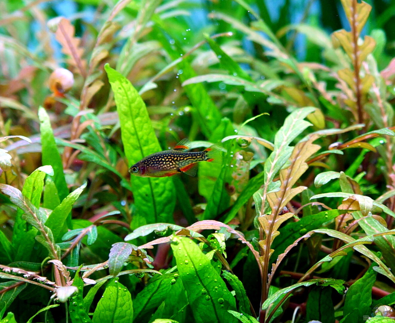 Fische: - 40-45 Perlhuhnbärblinge (Danio margaritatus) Häufig liest man, dass die Perlhühner sehr scheu sind und sich nur verstecken. Hier sind sie aktive Schwimmer, die gerne an die Frontscheibe kommen wenn man man ans Aquarium tritt um auf Futter zu hoffen, und auch bei vollem Licht (0, 78 Watt/Liter) im freien Schwimmraum bis dicht unter der Wasseroberfläche unterwegs sind. Allerdings steht das Becken auch an einer ruhigen Stelle. Die Perlhühner danken es hin und wieder mit Nachwuchs, [...]