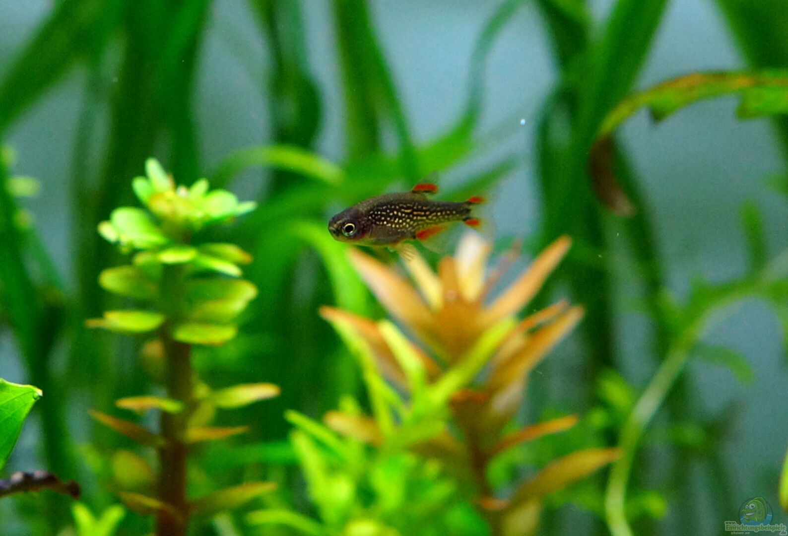 Fische: - 40-45 Perlhuhnbärblinge (Danio margaritatus) Häufig liest man, dass die Perlhühner sehr scheu sind und sich nur verstecken. Hier sind sie aktive Schwimmer, die gerne an die Frontscheibe kommen wenn man man ans Aquarium tritt um auf Futter zu hoffen, und auch bei vollem Licht (0, 78 Watt/Liter) im freien Schwimmraum bis dicht unter der Wasseroberfläche unterwegs sind. Allerdings steht das Becken auch an einer ruhigen Stelle. Die Perlhühner danken es hin und wieder mit Nachwuchs, [...]
