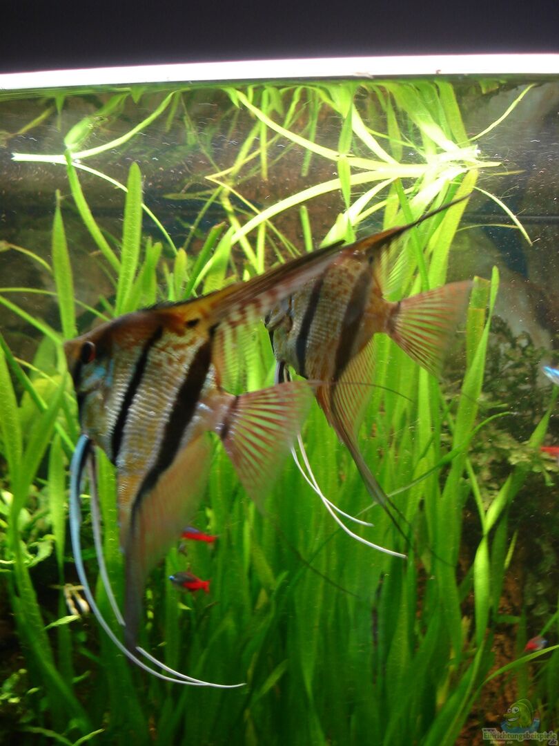 wechselnd Diskusfische, leider war das Mobbing sehr gro??, sodass zu Schluss nur noch 1 Paar übrig blieb, dann nur noch das Weibchen. Dann habe ich umgestellt auf Skalare u.a. Diverse Beifische, wie Neons, Corydoras, 3 Sturisome und Rotkopfsalmler