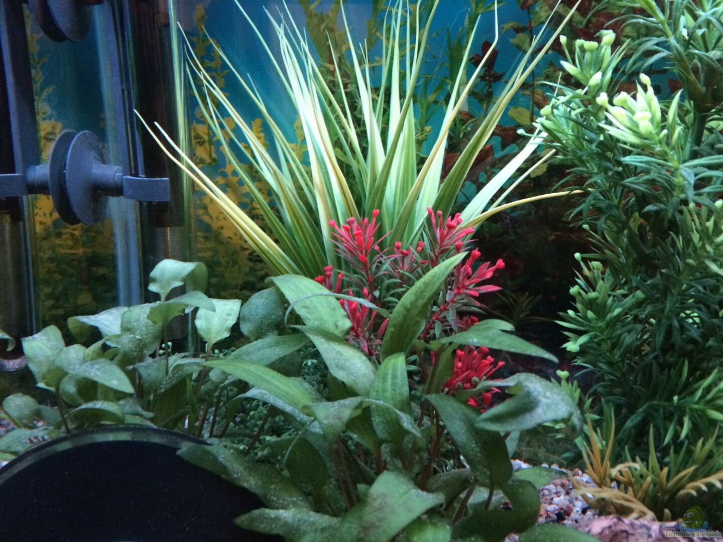 Aufgrund des eher schlecht zugänglichen Beckens mussten es langsam wachsende Wasserpflanzen sein. Im vorderen Bereich habe ich Cryptocoryne (Wasserkelch) verwendet. Die Hintergrundpflanzen stellten mich allerdings vor eine Herausforderung. Viele werden nun sagen: ???wie kann man nur???, aber ich habe Kunstpflanzen von Sydeco verwendet. Diese sind optisch wirklich ansprechend, und vor allem verändert sich unter Wasser nicht die Farbgebung. .