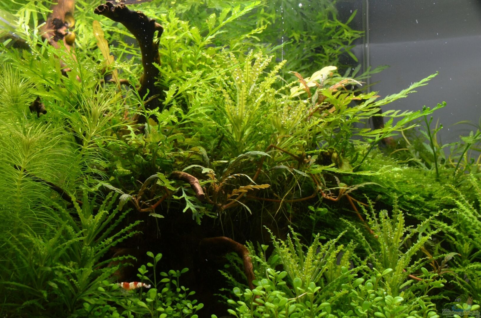Die meisten Pflanzen wurden aus In Vitro Kultur eingebracht: 1. Eleocharis sp. 'Mini'/ Mini-Nadelsimse (vorne rechts) 2. Glossostigma elatinoides/ Australisches Zungenblatt (vorne links) 3. Pogostemon helferi/ Kleiner Wasserstern 4. Rotala sp. "Green"/ Grüne Rotala (hinten links) 5. Pogostemon erectus/ Indische Sternpflanze (vorne ganz links) 6. Vesicularia "Christmas Moss"/ Weihnachtsbaummoos (aufgebunden auf rote Moorwurzel mit ADA Moos cotton) 7. [...]