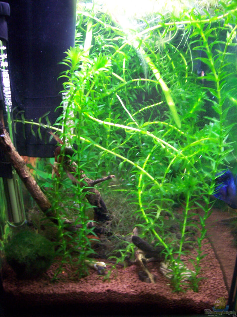 Wasserpest (Egeria densa) -> Vorrangig links vorn im Becken, rechts hinten, zudem als Schwimmpflanzen kreuz &. quer im mittleren und oberen Bereich des Beckens. Breitblättriges Speerblatt (Anubias barteri var. barteri) -> Vorrangig vorn rechts und hinten in der Mitte zu finden. Wasserschraube (Vallisneria spiralis) -> Befindet sich im hinteren und vorderen Bereich der rechten Seite im Becken. Javamoos / Bogormoos (Taxiphyllum barbieri (Vesicularia)) -> Zu finden auf einem Ast im Aquarium, [...]