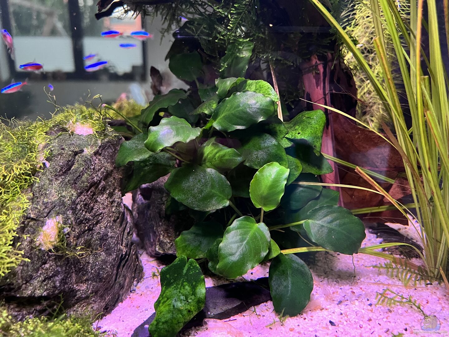Hintergrundpflanzen: 2?? Pogestomon Erectus 1?? Cyperus Helferi Mittlerer Teil: Dekowurzel bepflanzt (=geklebt) mit Taxiphyllum ???Spiky??? (Invitro) Steine bepflanzt (=geklebt) mit Riccia fluitans (Invitro) und Anubias barteri Vordergrundpflanzen: Hemianthus Callitrichoides Cuba (bin mir hier aber nicht mehr ganz sicher???) Düngung mit JBL Ferropol 1x pro Woche 10ml (nach Teilwasserwechsel) sowie 2 Tropfen täglich