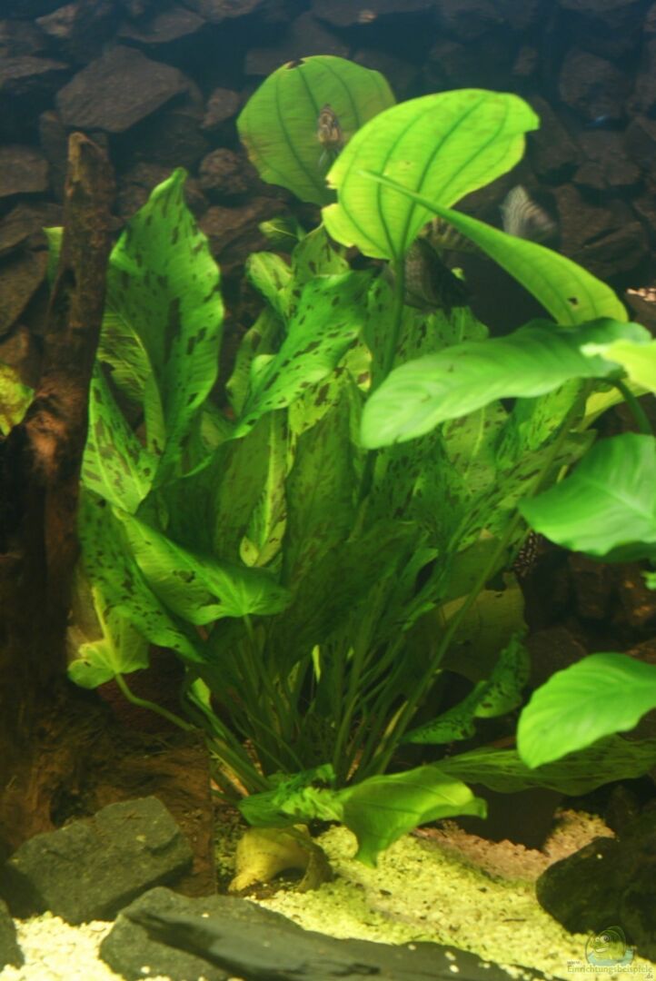 1x Speerblatt ( hinter der Wurzel ) 2x Anubis heterophylla ( rechts und links im vorderen Teil des Aquariums )