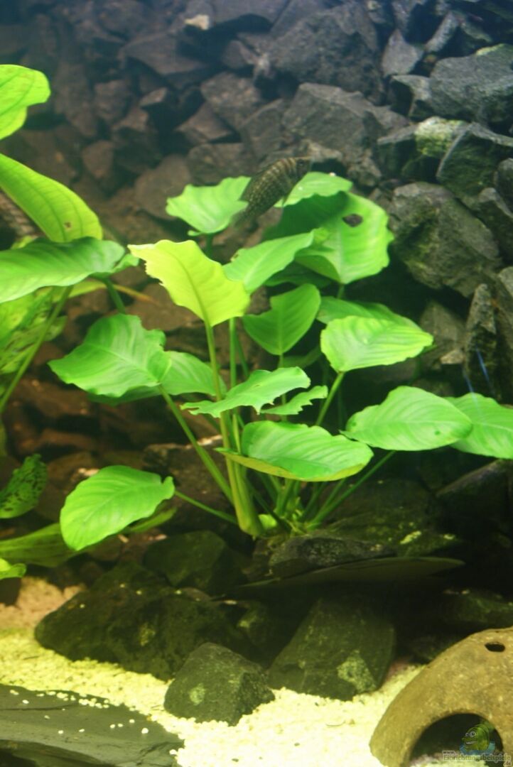1x Speerblatt ( hinter der Wurzel ) 2x Anubis heterophylla ( rechts und links im vorderen Teil des Aquariums )