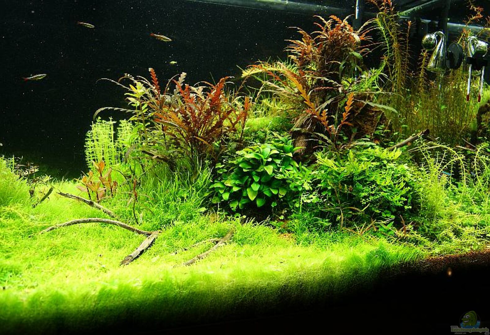Blyxa japonica Hydrocotyle verticillata Micranthemum umbrossum Hemianthus micranthemoides Hygrophila pinnatifida Persicaria (Polygonum) spec. Hygrophila spec. Araguaia Hemianthus callitrichoides cuba Eleocharis parvula Utricularia graminifolia Eleocharis vivipara Rotala Nansjen barteri var. nana 'Petite' ('Bonsai')" Staurogyne repens sowie Mosse: Christmas-Moos - Vesicularia montagnei Mini-Pellia - Riccardia chamedryfolia verwendet.