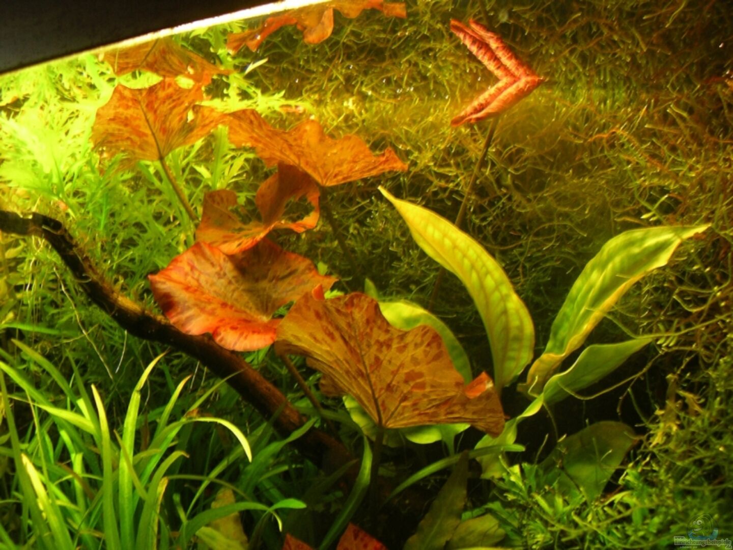 Lilaeopsis macloviana Alternanthera reineckii Heteranthera zosterifolia Mayaca fluviatilis Cryptocoryne beckettii Cryptocoryne undulata Cryptocoryne cordata Hygrophila difformis Bacopa caroliniana Microsorum pteropus ?????¢â??¬??¡????â?????´Windeløv?????¢â??¬??¡????â?????´ Nymphaea lotus Sagittaria subulata Javamoos ermeres Moos auf der hinteren Querverstrebung Düngung: täglich Ferrdrakon wöchentl. Kaliumnitrat, Kaliumcarbonat, Ammoniumcarbonat, [...]