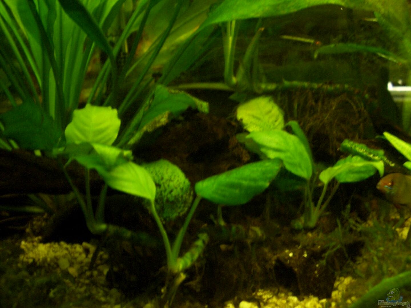1x gro??e Schwertpflanze (Echinodorus bleheri) ca. 4 Zwergspeerblatt (Anubias bateri) 1x gro??er (kleiner) Wasserkelch (Cryptocoryne parva) +mehrer Ableger davon im Aquarium verteilt 1-3x Valisneria Manchmal kommen noch nen paar Seemandelbaumblätter rein Gedüngt wird mit dem Düngeplan von Dennerle!