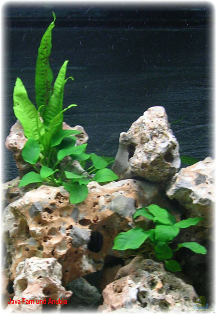 4 - Anubias barteri var. nana, auf Steine gepflanzt, sehr wuchsfreudige Pflanze die schon mehrfach blühte. 1 - Anubias hastiflia 1 - Anubias congensis 1 - Anubias afzelii 1 - Cryptocoryne aponogetifolia, Riesen-Cryptocoryne als Hintergrundpflanze in der Filteraustrittsströmung.