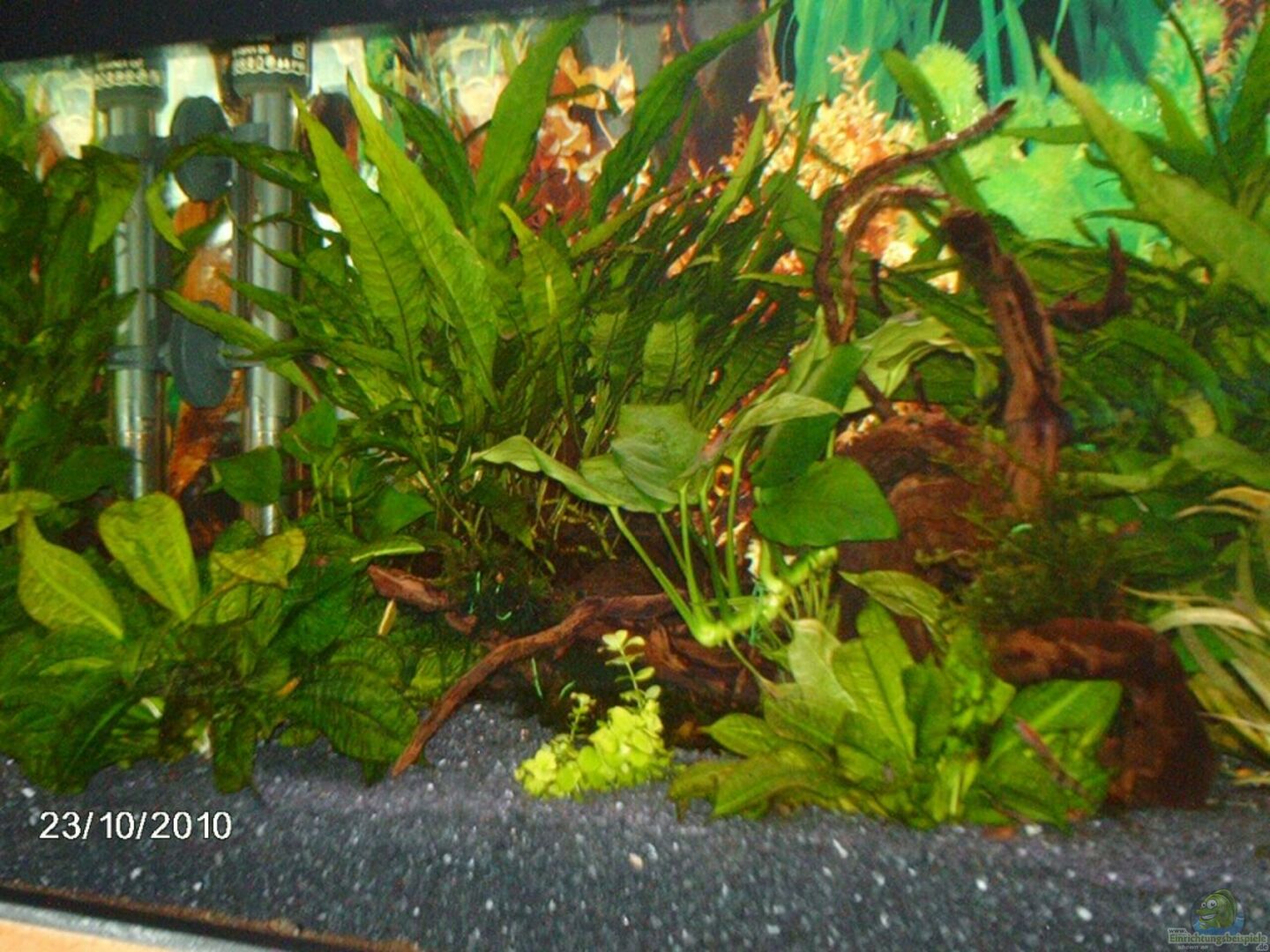 Im hinteren Bereich auf Holz gebunden: -Microsorum pteropus ( Java-Farn ) + Anubias barteri Im vorderen Bereich auch auf Holz gebunden: - Anubias barteri ( Zwergspeerblatt ) und - Vesicularia dubyana ( Javamoos )sowie: -Sagittaria platyphylla ( Breitblättriges Pfeilkraut ) - Armoracia aquatica ( Wassermerrettich ) - Micranthemum umbrosum ( perlenkraut )