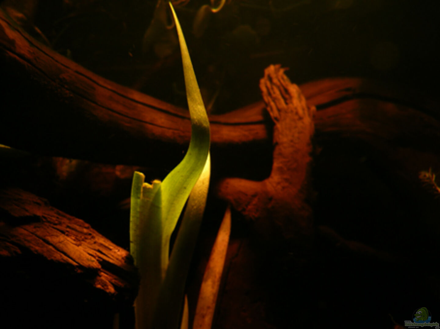 Im Aquarium wurde fast ganz auf hoch wachsenden Pflanzen verzichtet.Die Rückwand wird von Aufsitzerpflanzen und Wurzeln verdeckt, vor dem Filter schwimmen Schwimmpflanzen, deren Wurezeln diesen verdecken. Wassernabel verstecken das Auslassrohr des Filters _____ Diese Pflanzen wurden eingesetzt: Bolbitis heudelotii - Kongo-Wasserfarn Pistia stratiotes - Muschelblume (die kleinen) Anubias bateri nana - Zwergspeerblatt Myriophyllum hippuroides - Dichtblättriges Tausendblatt Hydrocotyle [...]