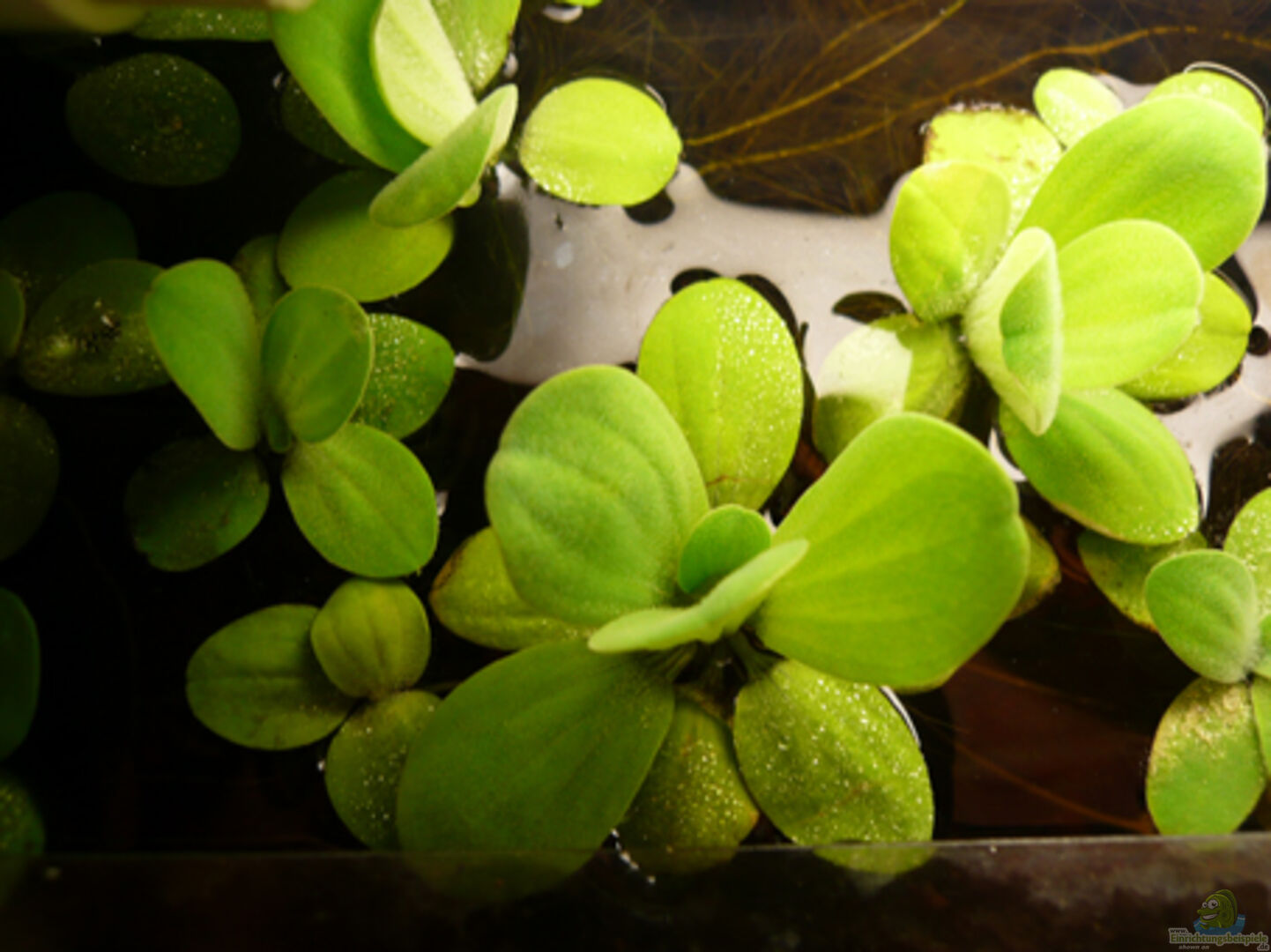 Im Aquarium wurde fast ganz auf hoch wachsenden Pflanzen verzichtet.Die Rückwand wird von Aufsitzerpflanzen und Wurzeln verdeckt, vor dem Filter schwimmen Schwimmpflanzen, deren Wurezeln diesen verdecken. Wassernabel verstecken das Auslassrohr des Filters _____ Diese Pflanzen wurden eingesetzt: Bolbitis heudelotii - Kongo-Wasserfarn Pistia stratiotes - Muschelblume (die kleinen) Anubias bateri nana - Zwergspeerblatt Myriophyllum hippuroides - Dichtblättriges Tausendblatt Hydrocotyle [...]