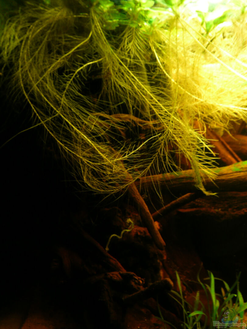 Im Aquarium wurde fast ganz auf hoch wachsenden Pflanzen verzichtet.Die Rückwand wird von Aufsitzerpflanzen und Wurzeln verdeckt, vor dem Filter schwimmen Schwimmpflanzen, deren Wurezeln diesen verdecken. Wassernabel verstecken das Auslassrohr des Filters _____ Diese Pflanzen wurden eingesetzt: Bolbitis heudelotii - Kongo-Wasserfarn Pistia stratiotes - Muschelblume (die kleinen) Anubias bateri nana - Zwergspeerblatt Myriophyllum hippuroides - Dichtblättriges Tausendblatt Hydrocotyle [...]