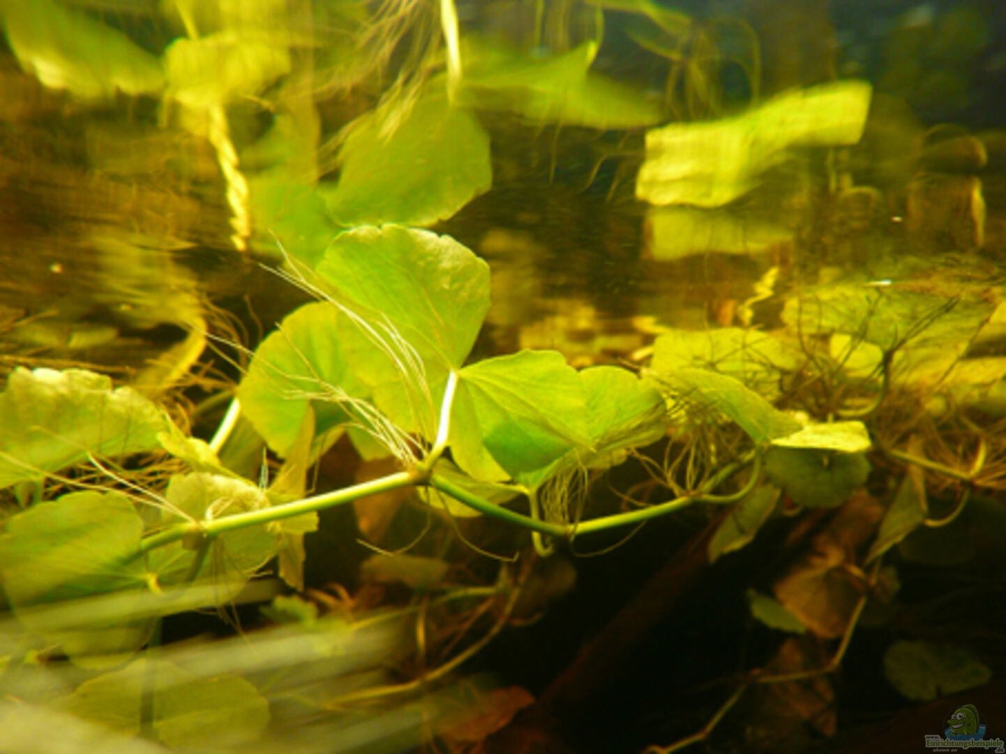 Im Aquarium wurde fast ganz auf hoch wachsenden Pflanzen verzichtet.Die Rückwand wird von Aufsitzerpflanzen und Wurzeln verdeckt, vor dem Filter schwimmen Schwimmpflanzen, deren Wurezeln diesen verdecken. Wassernabel verstecken das Auslassrohr des Filters _____ Diese Pflanzen wurden eingesetzt: Bolbitis heudelotii - Kongo-Wasserfarn Pistia stratiotes - Muschelblume (die kleinen) Anubias bateri nana - Zwergspeerblatt Myriophyllum hippuroides - Dichtblättriges Tausendblatt Hydrocotyle [...]