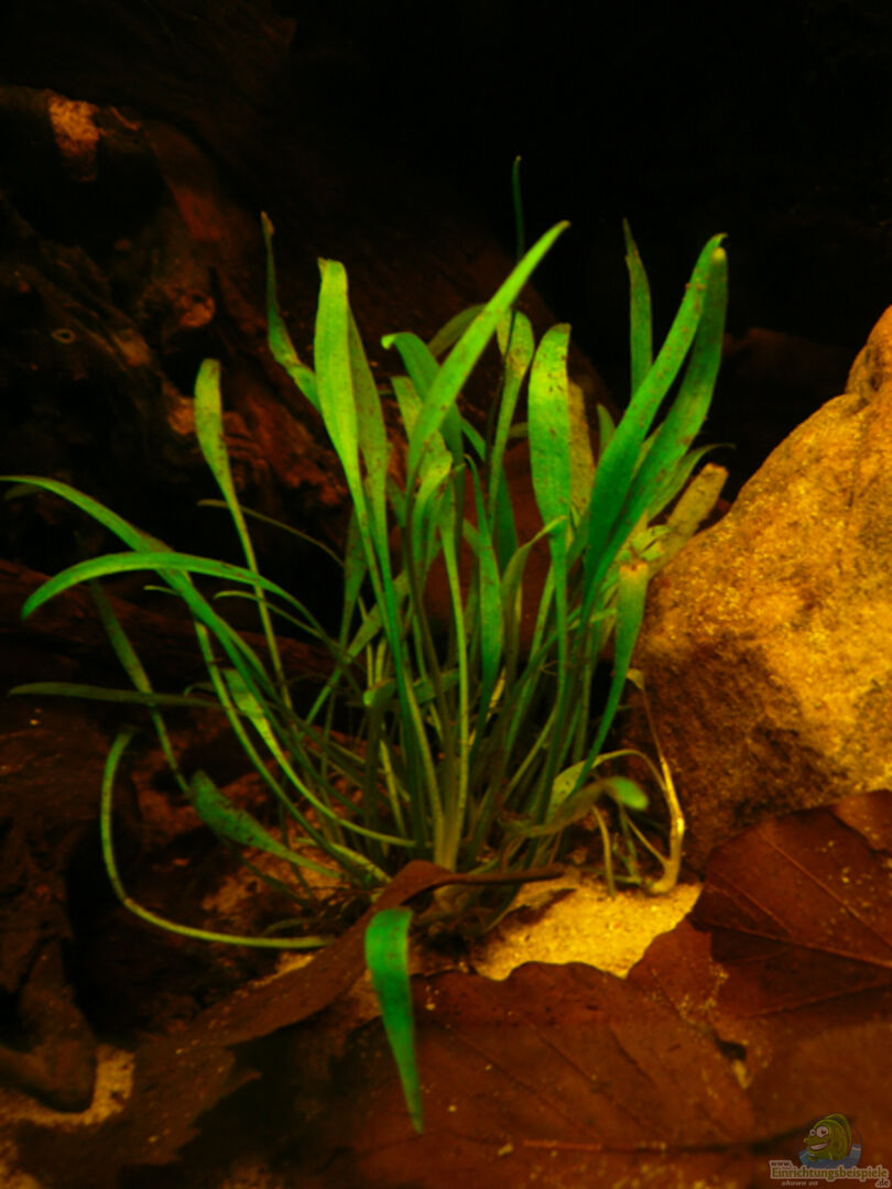 Im Aquarium wurde fast ganz auf hoch wachsenden Pflanzen verzichtet.Die Rückwand wird von Aufsitzerpflanzen und Wurzeln verdeckt, vor dem Filter schwimmen Schwimmpflanzen, deren Wurezeln diesen verdecken. Wassernabel verstecken das Auslassrohr des Filters _____ Diese Pflanzen wurden eingesetzt: Bolbitis heudelotii - Kongo-Wasserfarn Pistia stratiotes - Muschelblume (die kleinen) Anubias bateri nana - Zwergspeerblatt Myriophyllum hippuroides - Dichtblättriges Tausendblatt Hydrocotyle [...]