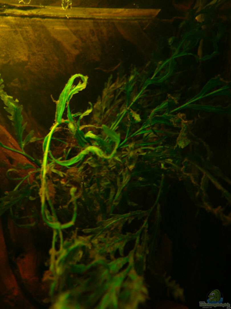 Im Aquarium wurde fast ganz auf hoch wachsenden Pflanzen verzichtet.Die Rückwand wird von Aufsitzerpflanzen und Wurzeln verdeckt, vor dem Filter schwimmen Schwimmpflanzen, deren Wurezeln diesen verdecken. Wassernabel verstecken das Auslassrohr des Filters _____ Diese Pflanzen wurden eingesetzt: Bolbitis heudelotii - Kongo-Wasserfarn Pistia stratiotes - Muschelblume (die kleinen) Anubias bateri nana - Zwergspeerblatt Myriophyllum hippuroides - Dichtblättriges Tausendblatt Hydrocotyle [...]