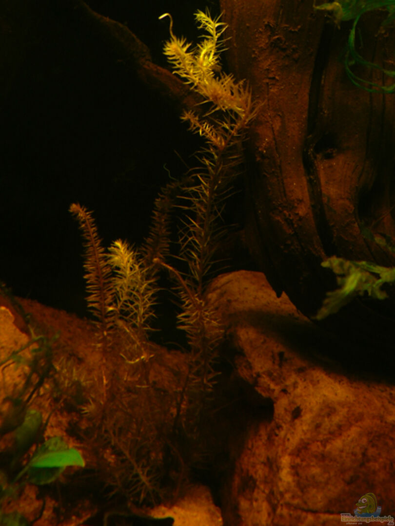 Im Aquarium wurde fast ganz auf hoch wachsenden Pflanzen verzichtet.Die Rückwand wird von Aufsitzerpflanzen und Wurzeln verdeckt, vor dem Filter schwimmen Schwimmpflanzen, deren Wurezeln diesen verdecken. Wassernabel verstecken das Auslassrohr des Filters _____ Diese Pflanzen wurden eingesetzt: Bolbitis heudelotii - Kongo-Wasserfarn Pistia stratiotes - Muschelblume (die kleinen) Anubias bateri nana - Zwergspeerblatt Myriophyllum hippuroides - Dichtblättriges Tausendblatt Hydrocotyle [...]