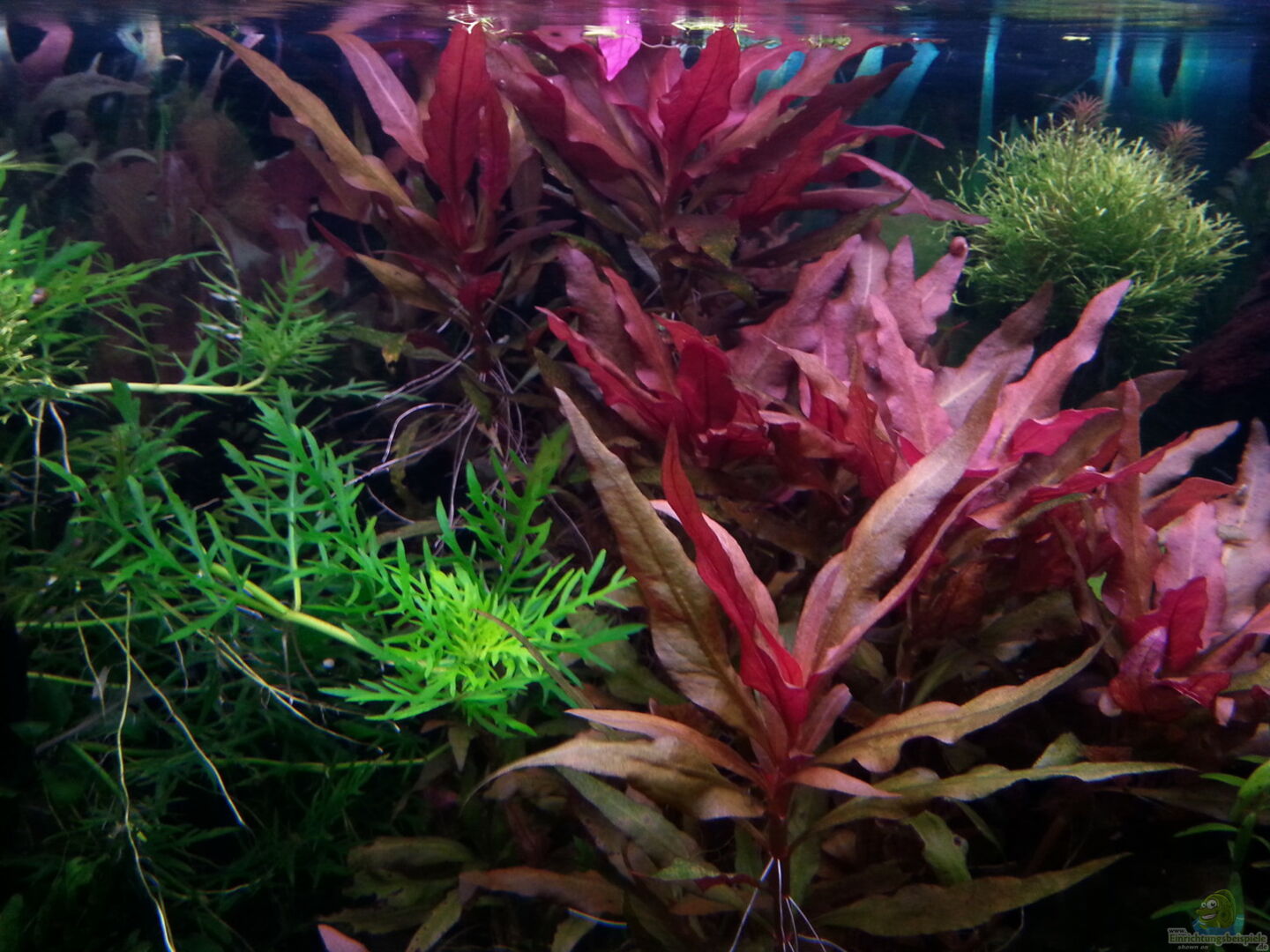 Anubias Barteri Echinodorus Bleheri Hemianthus Callitrichoides Bolbitus Heudelotii Riccia Fluitans Rotala Wallichii Taxiphyllum Barbieri Hygrophila corymbosa Microsorum Pteropus Düngung: täglich Aqua Rebell -Makro Basic Estimative Index -Makro Basic - Nitrat -Mikro Basic - Eisenvolldünger
