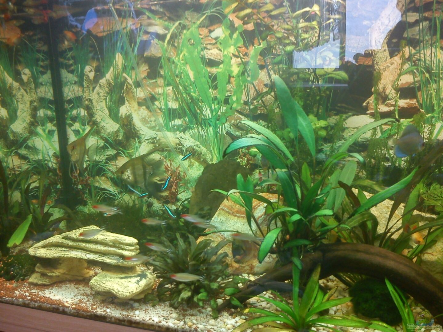 3x Mooskugel 2x Ludwigia mullertii 1x Echinodorus Dschungelstar Nr.2 1x Echinodorus bleheri 1xEchinodorus Scarlet Snake 3x Cryptocoryne wendtii 1x Javamoos auf Kokosnusschale 1x Anubia 3x Wasserpest Dann sind noch einige andere Pflanzen die ich aus einem Früherem Aquarium übernommen hab bei denen ich aber den Namen ni mehr weis. Düngung erfolgt über Co2 und Dennerle DüngesystemS7, E15 , E30