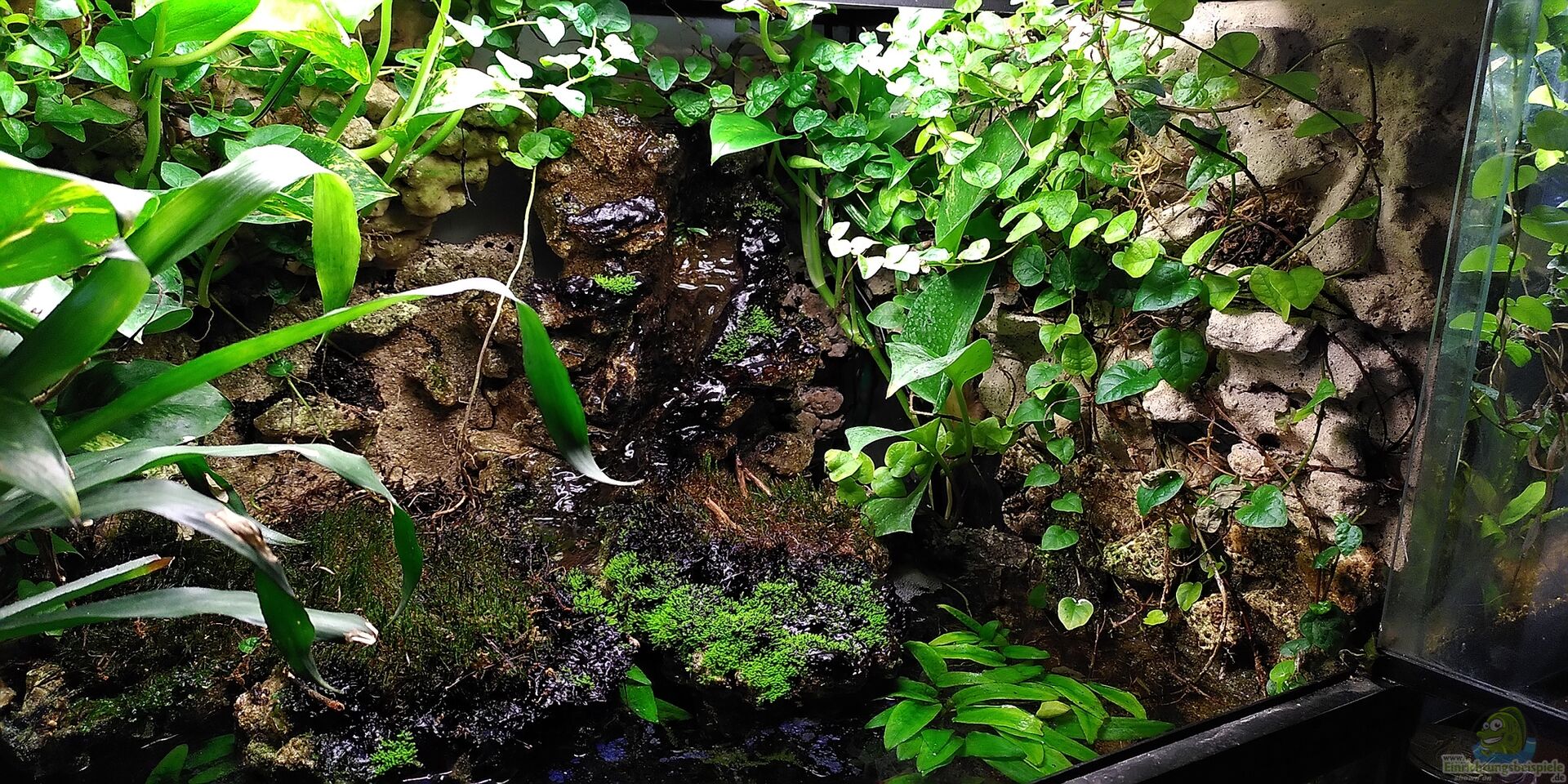 Verwendet wurden nur Pflanzen aus dem asiatischen Raum; im Wasserteil: Speerblatt, durch die neue Beleuchtung wird hoffentlich die Auswahl möglicher Pflanzen größer. Emers: Ficus pumila, Efeutute, Moos Zusätzlich noch eine "kontinentfremde" Bromelie, die aber schon das Becken bewohnte, bevor es asiatisch wurde