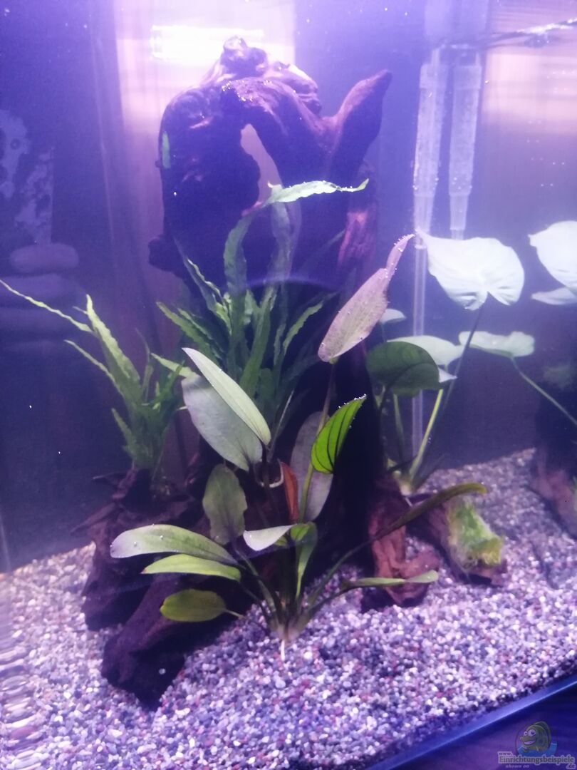 1x Echinodorus barthii 1x Anubia barteri auf Wurzel gebunden. 1x Schwarzwurzel Farn Microsorum pteropus wurde einmal geteilt und auf die Wurzel gebunden. 1x Riccia fluitans wurde ebenfalls geteilt und an 3 verschiedenen Stellen auf die Wurzeln gebunden. 1x Salvinia auriculata