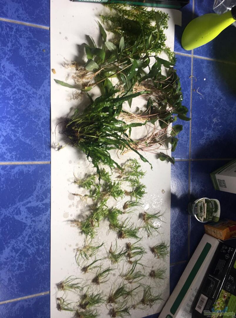 Vordergrund: Eleocharis pusilla (invitro) Pogostemon helferi Mittig: Cryptocoryne wendtii "Braun" Microsorum pteropus auf Mangrovenholz Hintergrund: Hygrophila corymbosa "Stricta" Egeria Densa Schwimmpflanzen: Muschelblumen