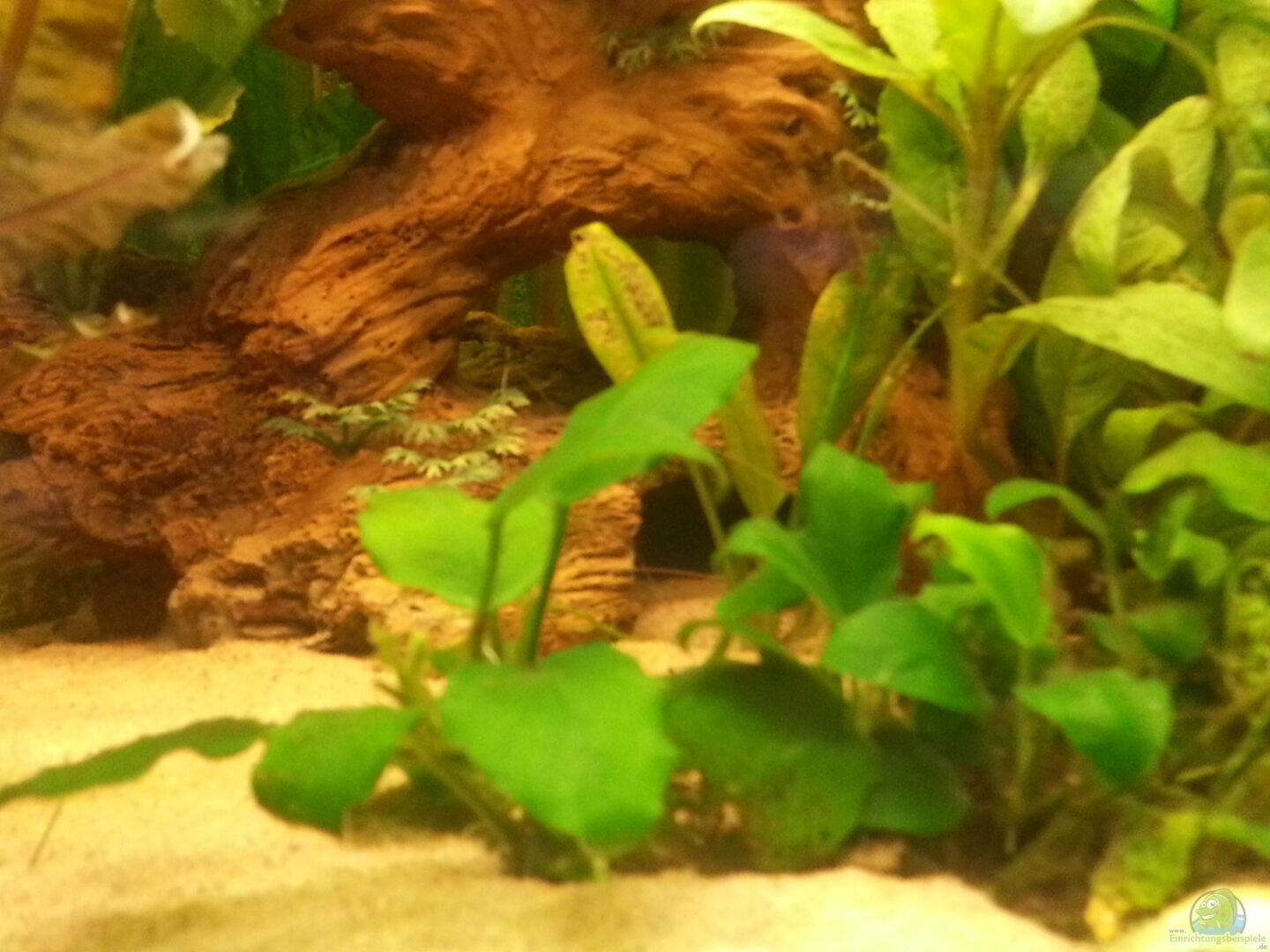Hindergrund: - Brasilianischer Wassernabel, Hydrocotyle leucocephala - Boivins Wasserähre, Aponogeton boivinianus - Anubias nana(findet sich ??berall im Aquarium wieder) - Gro??e Cognacpflanze, Ammannia gracilis - Rote Sumpf-Ludwigie, Ludwigia palustris Rot - Riesenvallisnerie, Vallisneria gigantea (Die einzige Pflanze die trotz fehlender Düngung gewachsen ist) Mittelgrund/Vordergrund: - Brauner Wasserkelch, Cryptocoryne wendtii braun - Breitblättriger Javafarn, Microsorium [...]
