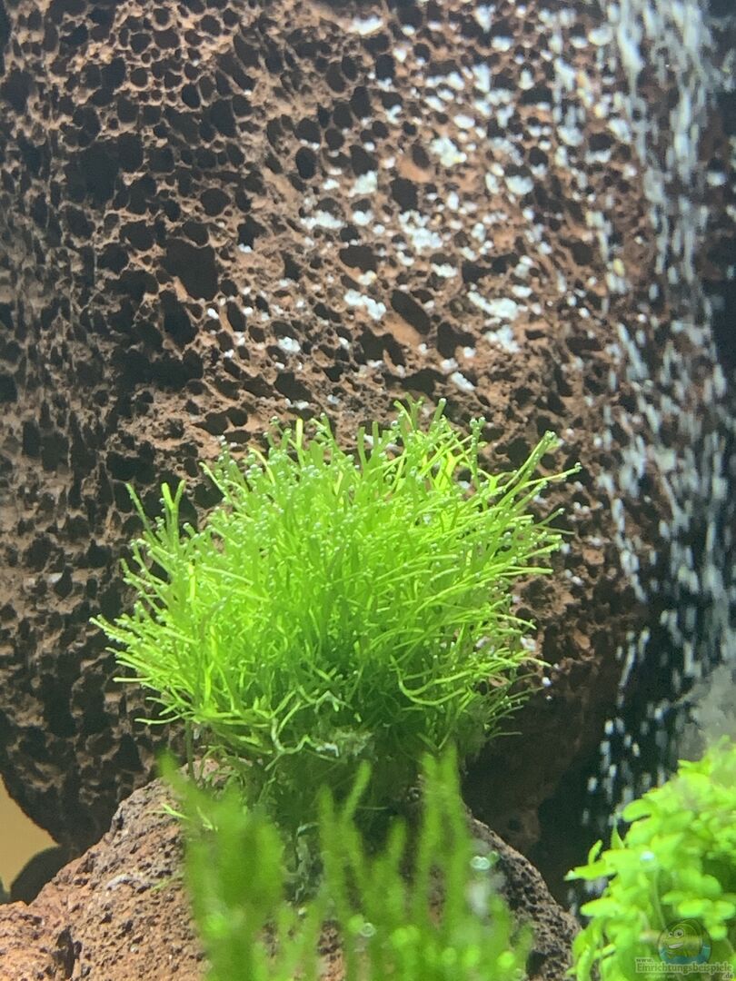 Bodendecker: Eleocharis Acicularis "Mini" gemischt mit Glossostigma Elatinoides Hintergrund und Akzente: Alternanthera Reineckii "Mini" Eriocaulon Cinereum Moose auf den Steinen: Riccia Fluitans Taxiphyllum spec. Flame Auf den Bäumen: Micranthemun "Monte Carlo"