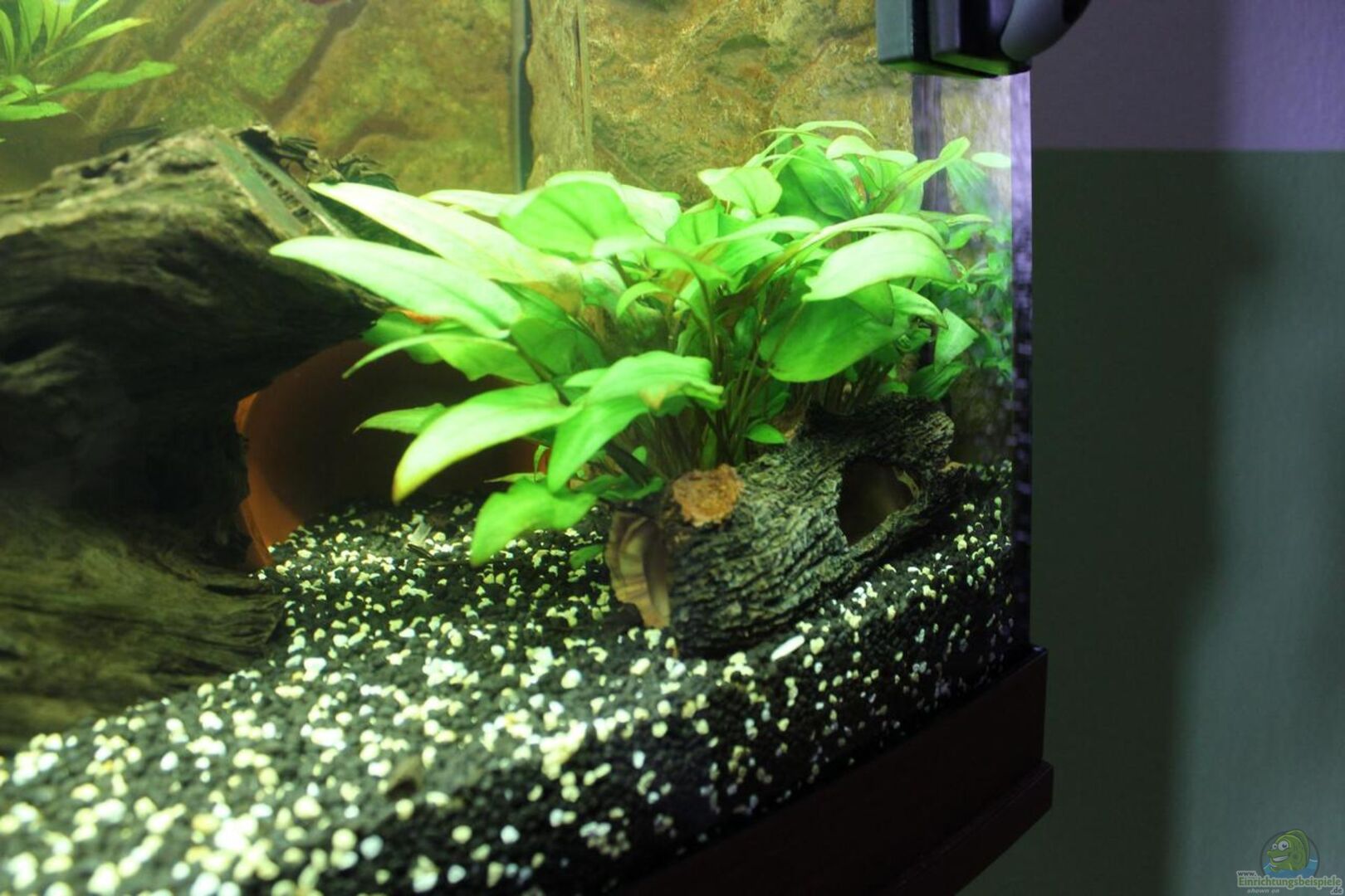 5x Anubias sp. 'Petite' - verteilt auf der gro??en Mangrovenwuzel 1x Hygrophila 'Siamensis53B' 2x Cryptocoryne wendtii green 3x Echinodorus bleheri Gedüngt werden die Pflanzen mit den "Dennerle Power Tabs" die in den Bodengrund nahe der Wurzeln eingebracht sind.