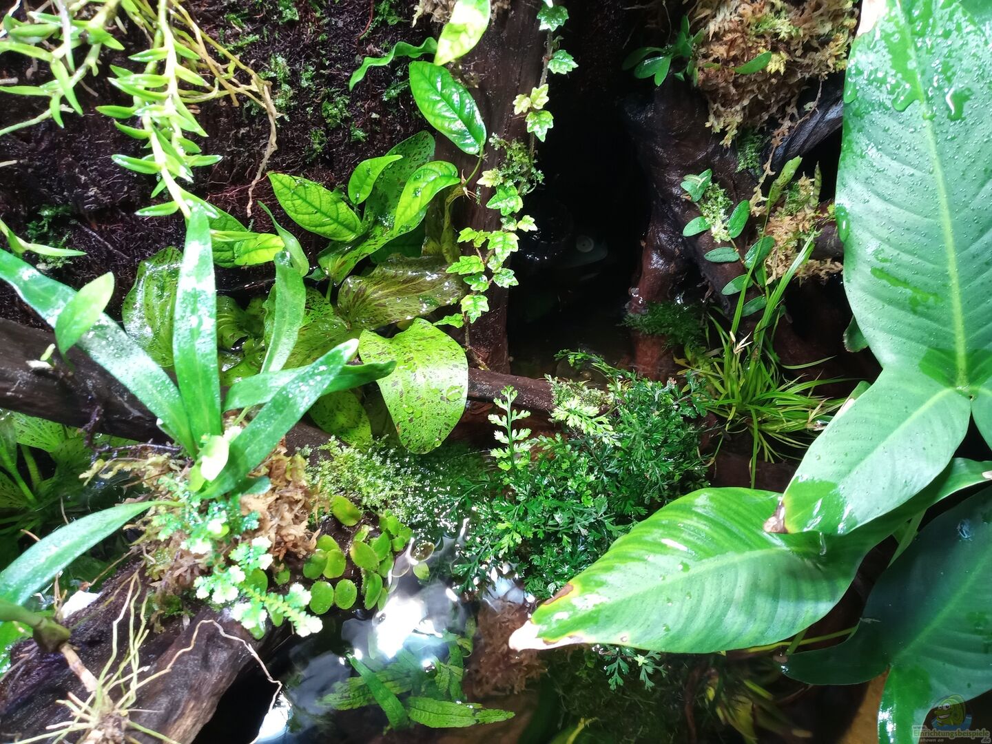 Emerse Pflanzen: Orchideen: Epidendrum porpax, Bulbophyllum species, Specklinia grobyi, Epidendrum centropetalum Farne: Microgramma lycopodioides, Pyrrosia lanceolata, Pesopteris crassifolia, Bolbitis heteroclita difformis, Selaginella kraussiana, Polypodium vulgare Bromelien und sonstige: Neoregelia punctatissima var. wide leaf, Neoregelia mephisto Begonia schulzii, Monstera acuminata, Versicularia montagnei Krabi, Anubias hastifolia, Cyperus helferi, Echinodorus Ozelot Submerse [...]