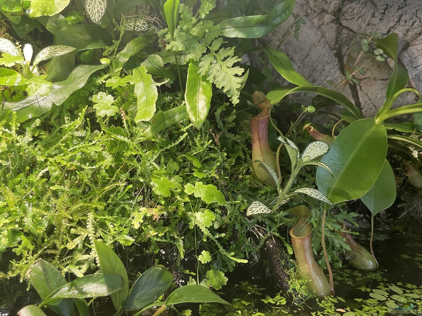 Submers: - Taxiphyllum barbieri - Hydrocotyle tripatita - Riccia fluitans Emers: - Ficus pumila - Fittonia verschaffeltii - Anubias barteri - Nepenthes sp. borneo - Microsorum punctataum - Selaginella uncinata - Asplenium trichomanes - Schefflera - Maranta leuconeura - Hydrocotyle tripatita - Neoregelia - Begonia thelmae