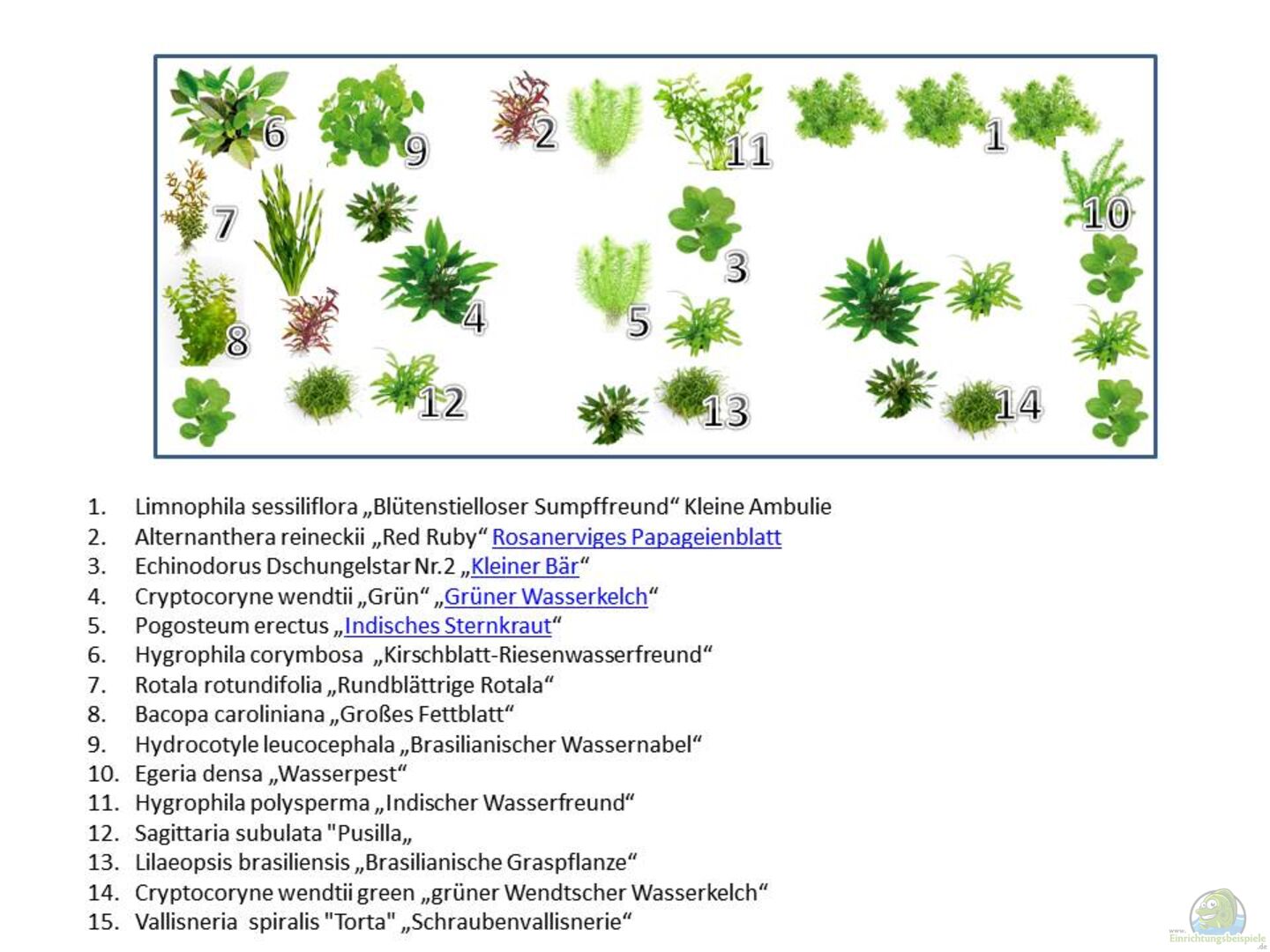 Limnophila sessiliflora ???Blütenstielloser Sumpffreund??? Kleine Ambulie Alternanthera reineckii ???Red Ruby??? Rosanerviges Papageienblatt Echinodorus Dschungelstar Nr.2 ???Kleiner Bär??? Cryptocoryne wendtii ???Grün??? ???Grüner Wasserkelch??? Pogosteum erectus ???Indisches Sternkraut??? Hygrophila corymbosa ???Kirschblatt-Riesenwasserfreund??? Rotala rotundifolia ???Rundblättrige Rotala??? Bacopa caroliniana ???Gro??es Fettblatt??? Hydrocotyle leucocephala ???Brasilianischer [...]