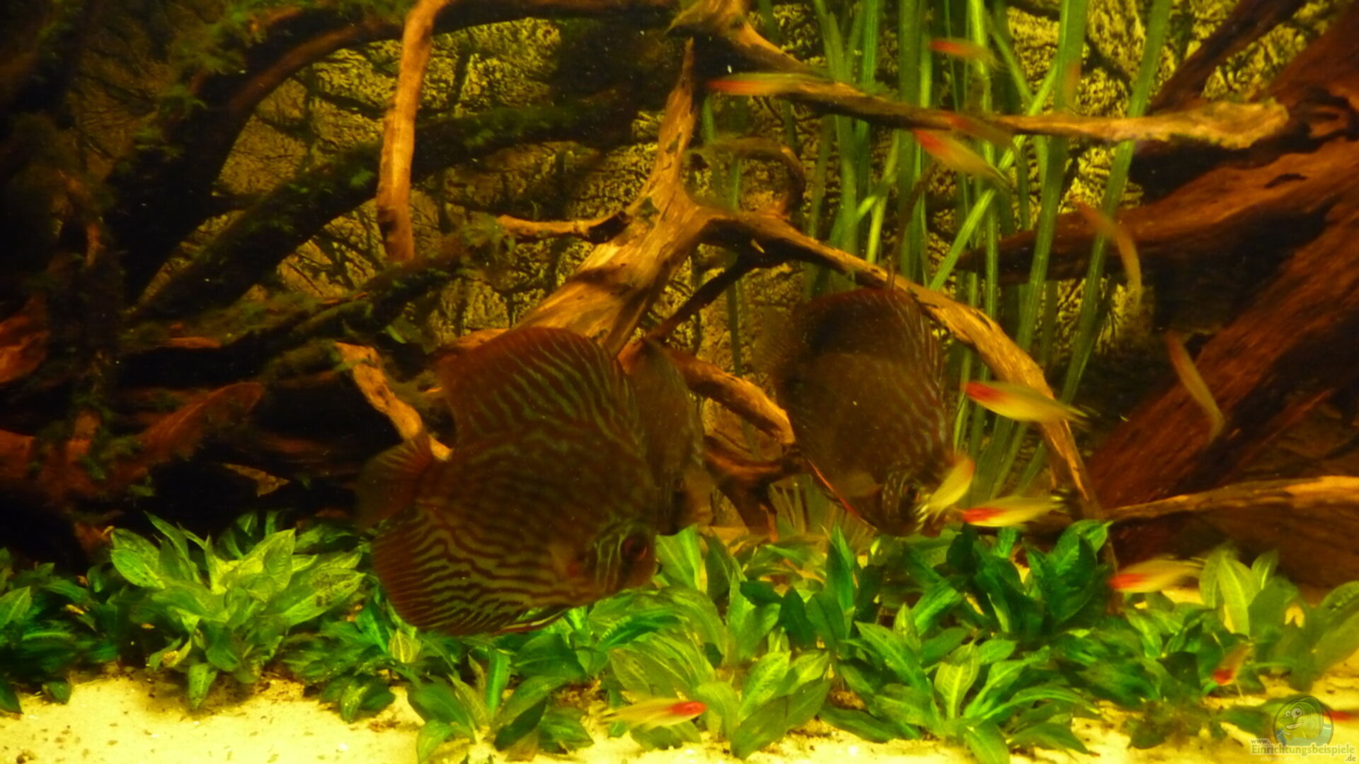 Rückwand aus Kunststoff, zusätzlich auch an den beiden Seitenscheiben. Steine 2 Stück, Grö??e ca. 10-20 cm. Die Steine befinden sich fast ausschlie??lich im hinteren Beckenbereich und dienen hauptsächlich dazu, die Rückwand zu fixieren. Sie sind zum grö??ten Teil im Bodengrund verborgen und fallen dadurch kaum auf. Wurzeln aus dem Zoofachhandel (verschiedene Sorten). Um gro??e Wurzeln zu erhalten, habe ich mehrere einzelne Wurzeln mit Kabelbindern und Edelstahlschrauben verbunden. [...]
