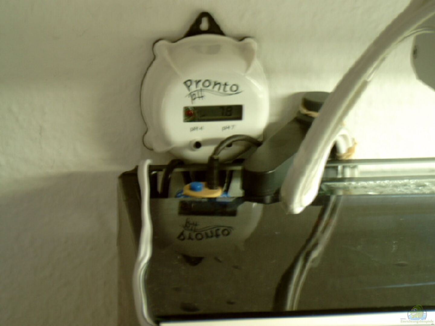 Jäger Regelheizer 300 Watt auf 27C eingestellt, ??berwacht durch ext. Digitalthermometer gefühlt mittlerer Wasserstand, Eheim Futterautomat 1xtäglich 1 Auswurf für den kleinen Hunger zwischendurch 2 Glasscheiben 1, 20mx15cm als Abdeckung mit Autoscheibenfolie schwarz abgetönt. 11 Watt UVC -Klärer