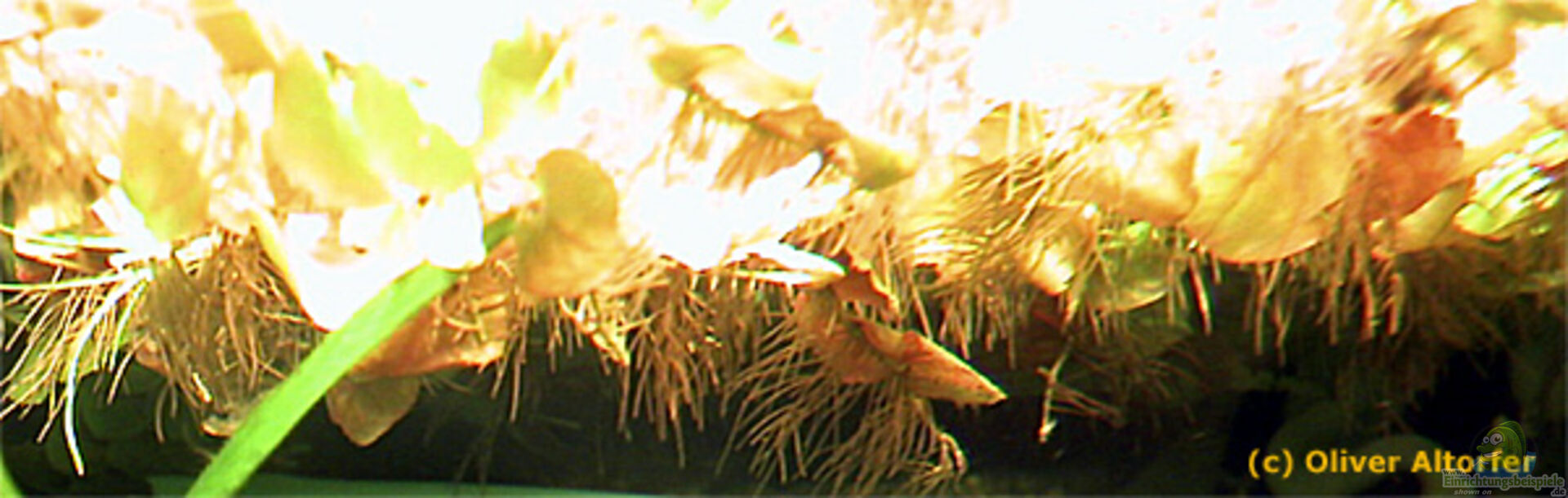 3 x Echinodorus bleherae 2 x Echinodorus subalatus 4 x Cryptocoryne wendtii ´brown´ 12 x Vallisneria nana 1 x Hygrophilia polysperma ´rosé´ 1 x Microsorum pteropus ´Windelov´ (auf Stein gebunden) 1 x Crinum natans 1 x Nymphea lotus ´red´ (roter Tigerlotus) 2 x Pogostemon stellatus 3 x feines, bodenbewachsendes Kraut (??) 2 x Mooskugel ? x Javamoos auf Mangrovenholzwurzel ? x Phyllantus fluitans 1 x Anubias nana auf Holzwurel
