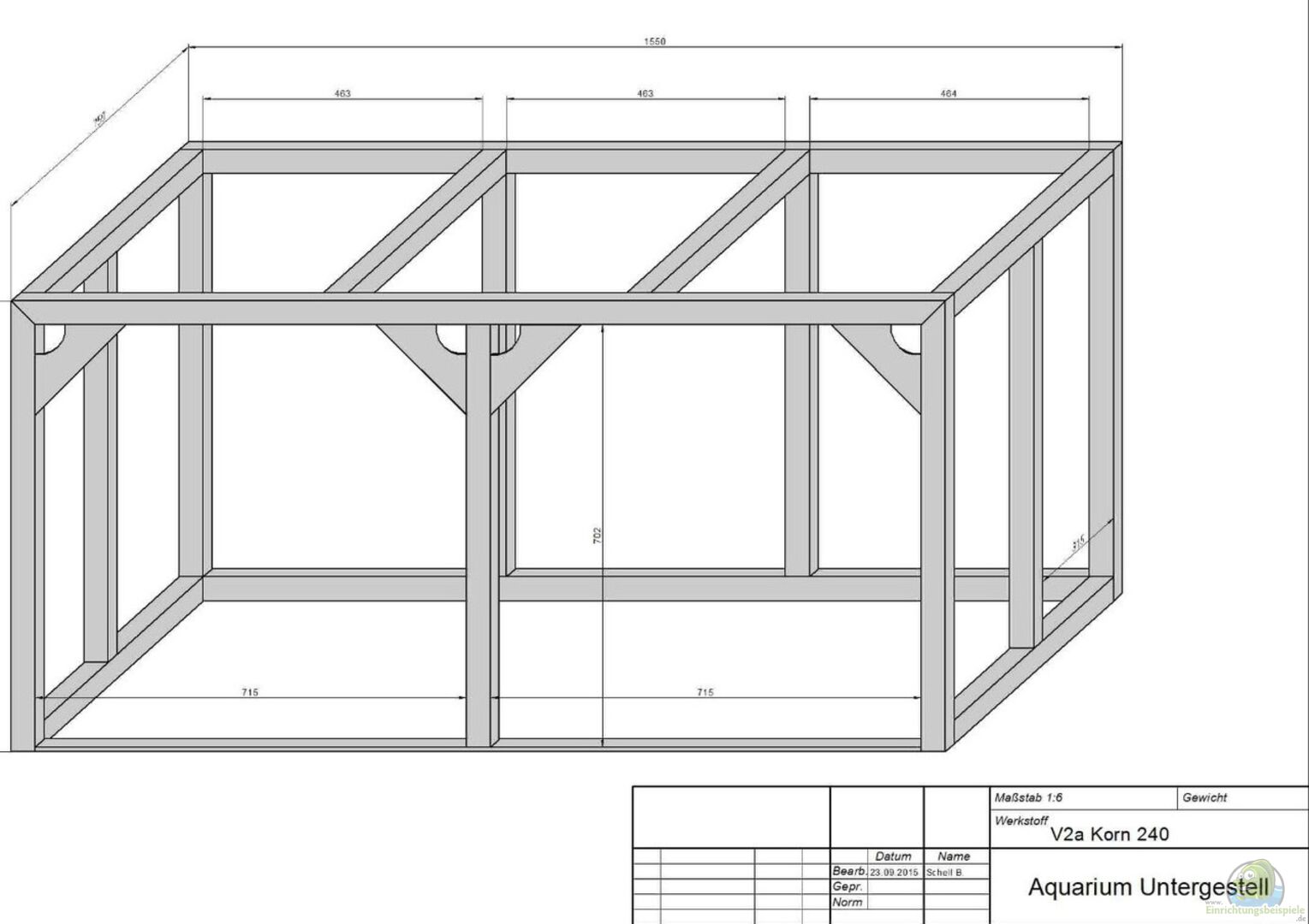 Becken von Brillant-Aquarium, 12mm Glasstärke, eine Querverstrebung, Wulstverklebung und wei??e Kiesblende. Die Abdeckung ist von Aquarienabdeckungen Runge (www.aquarienabdeckungen.com) und verfügt über 3 Klappen sowie 5 Bohrungen auf der Rückseite für Schläuche, Kabel etc. Die Unterkonstruktion ist selbstgebaut auf Stahl. Unter der Stahlkonstruktion befindet sich eine 4cm Küchenarbeitsplatte, ebenso zwischen Becken und Unterbau. Zudem wurde das Becken mit Schwerlastverankerungen [...]
